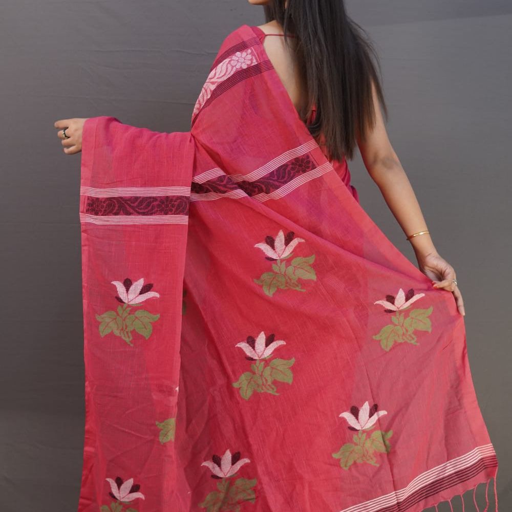 Elevate your style with this Elegant Linen Jamdani Saree in gajri, a perfect blend of tradition and modern elegance.