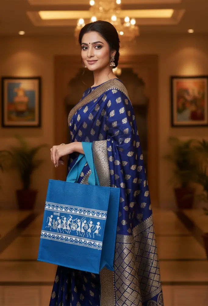 The NeelaNritya Handcrafted Jute Tote Bag draws inspiration from traditional tribal dance forms, beautifully hand-printed in white against a deep indigo blue base. Crafted on sturdy natural jute, this tote blends cultural storytelling with everyday functionality, making it a graceful statement for conscious living.