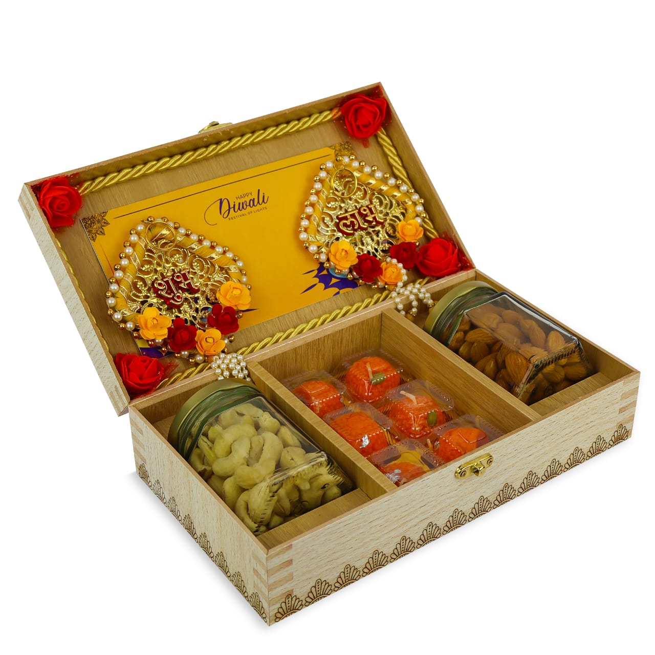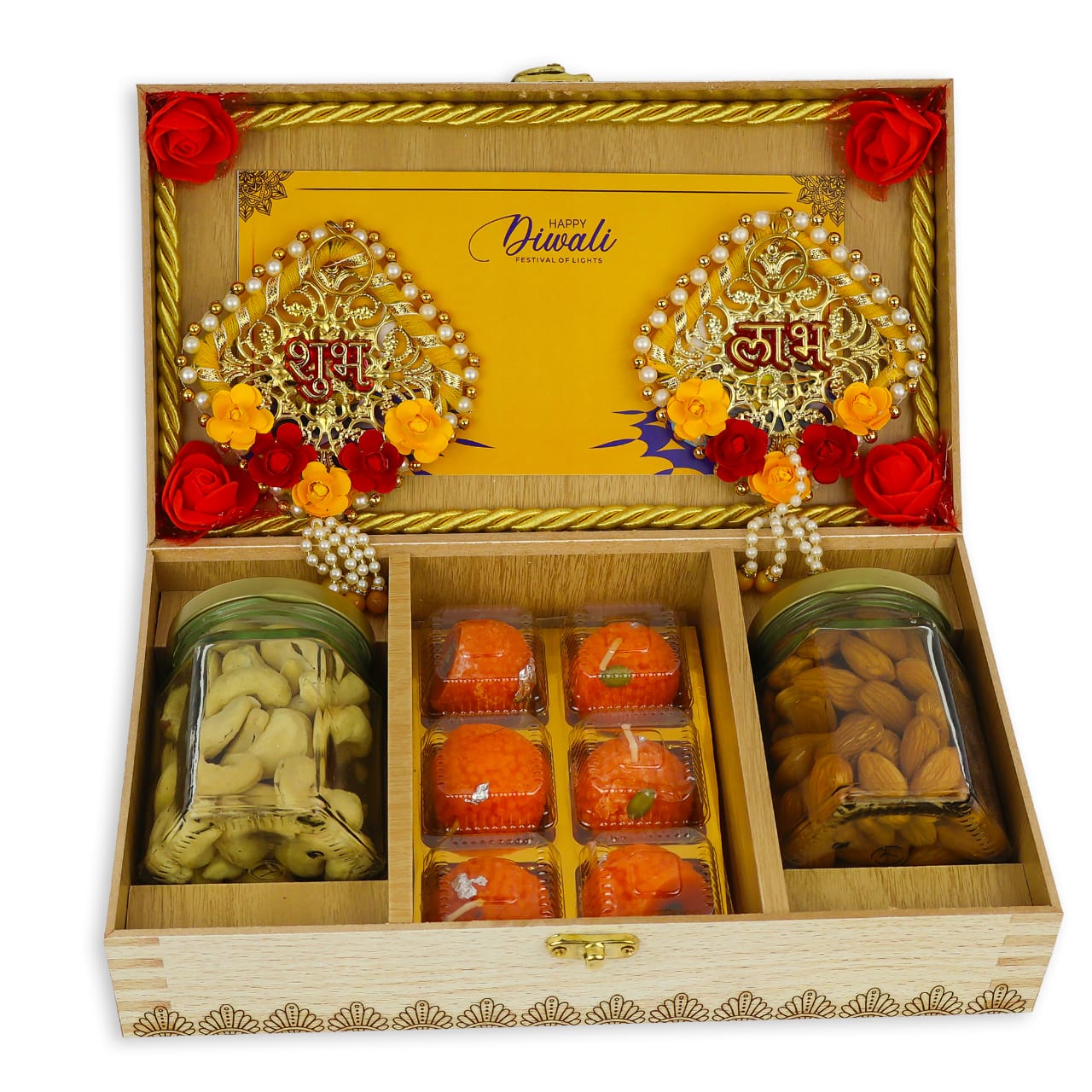 Festive Shubh Labh Diwali MDF Gift Box With Kaju Almonds And Laddu Candles