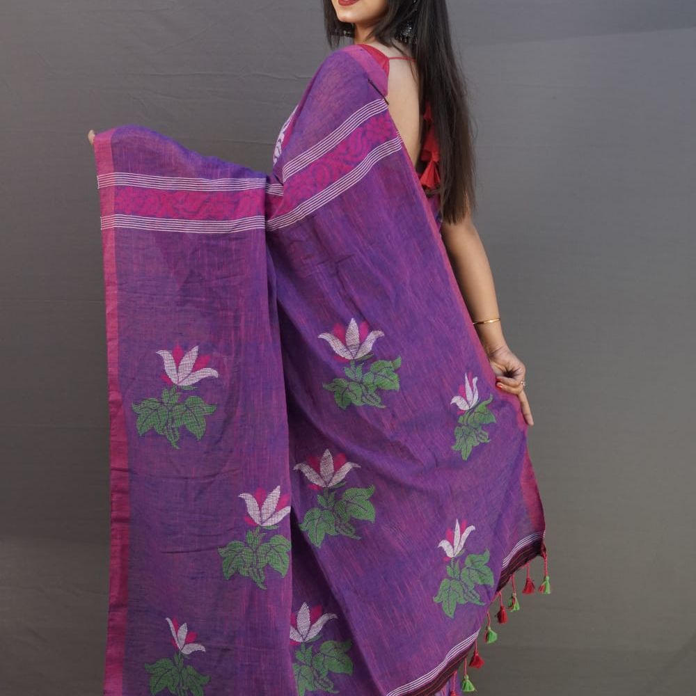 Enhance your wardrobe with this Elegant Linen Jamdani Saree in purple, a perfect blend of traditional craftsmanship and contemporary style.