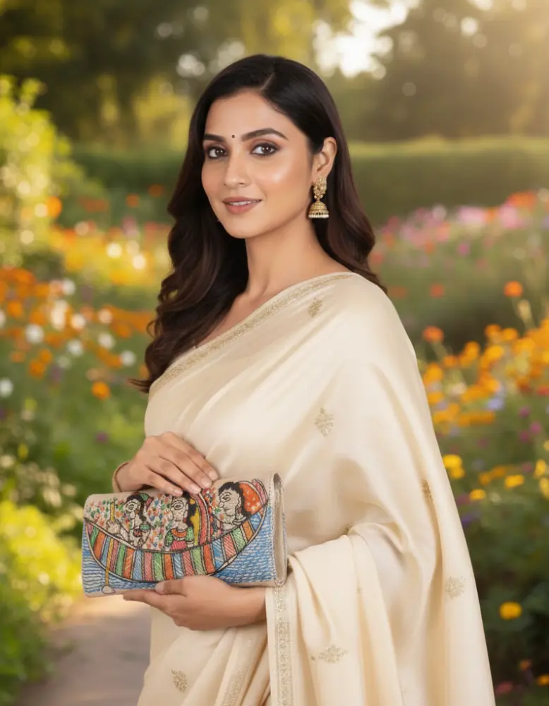 A graceful handcrafted clutch showcasing vibrant Madhubani storytelling on a soft beige canvas