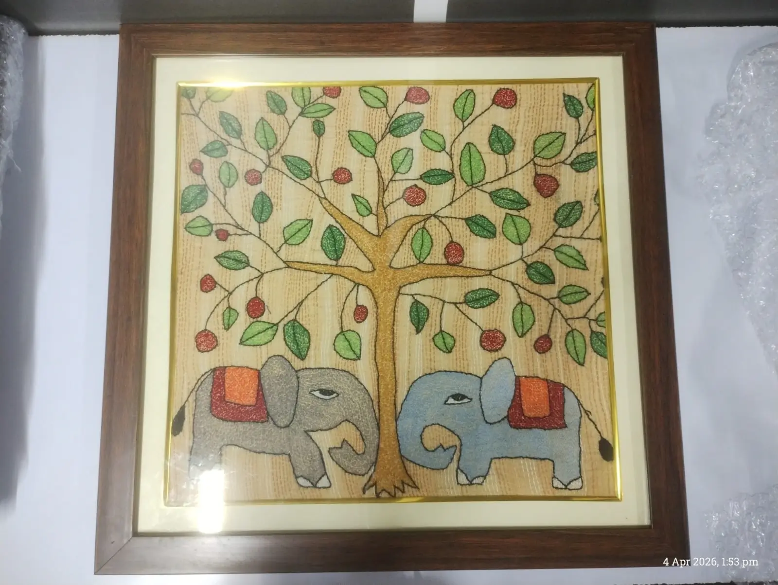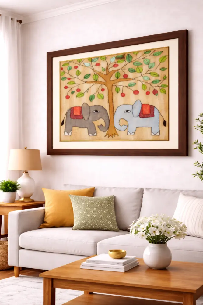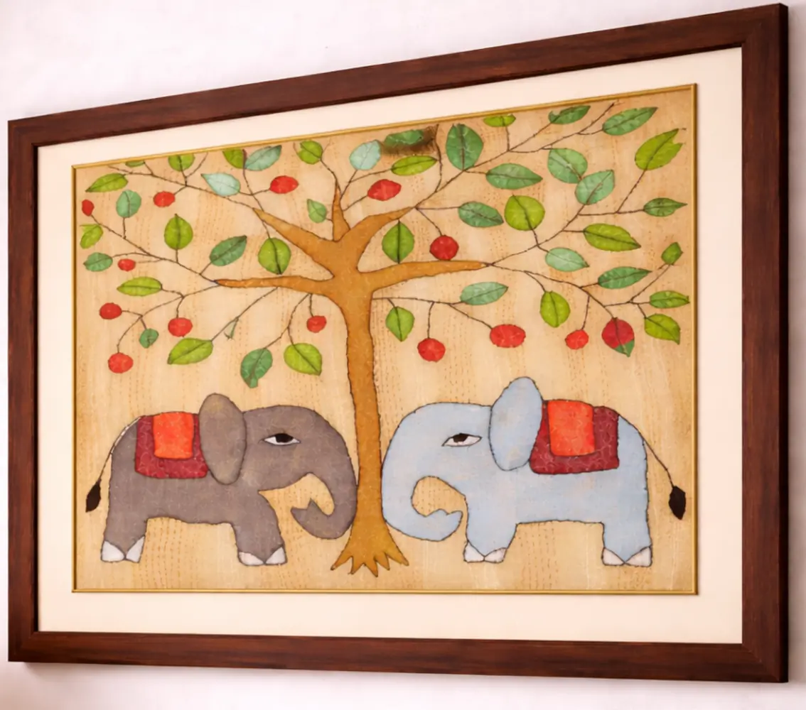 This framed Sujani painting is handcrafted by artisans from Bihar using traditional embroidery techniques. Featuring two elephants beneath a fruit-laden tree, it symbolizes balance, abundance, and companionship. Each piece is intricately hand-stitched on fabric and set in a premium wooden frame, blending cultural storytelling with elegant home décor.