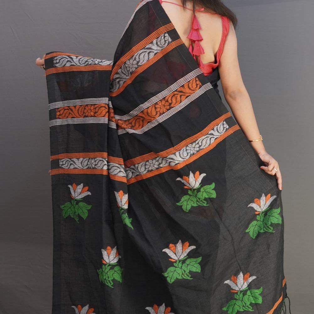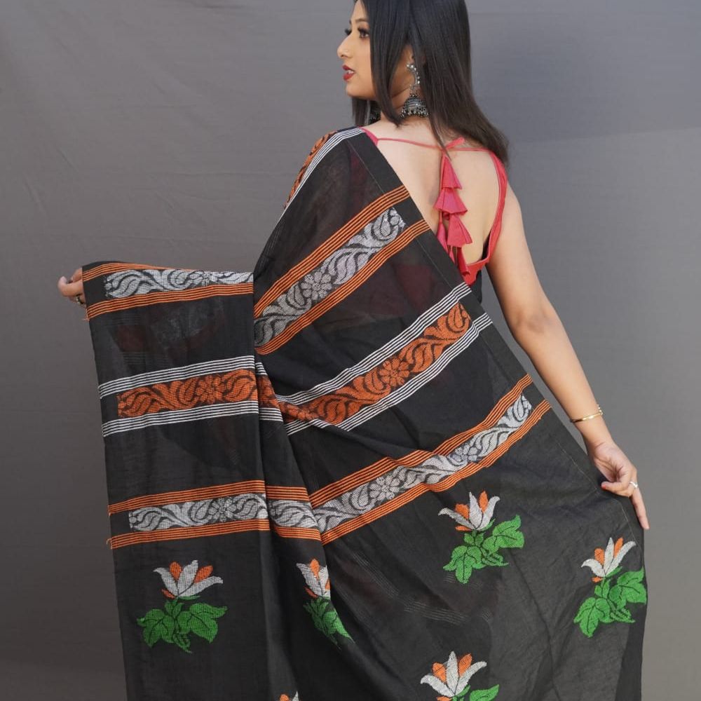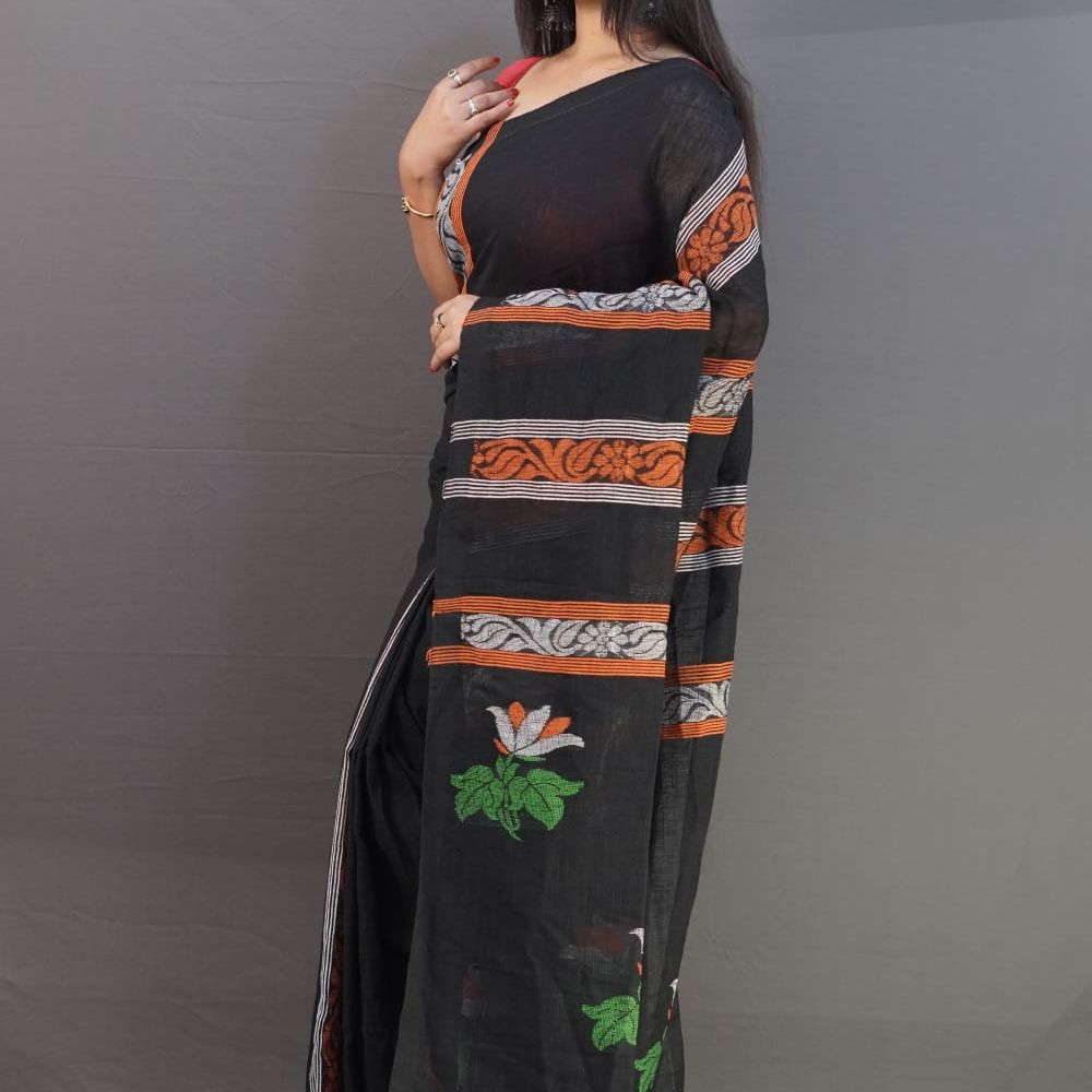 Make a bold statement with our Elegant Linen Jamdani Saree in classic black. Handcrafted from premium linen, this saree combines traditional artistry with contemporary style. The rich black base is beautifully adorned with vibrant floral motifs in shades of , green, orange, and white, intricately woven using the traditional Jamdani technique.