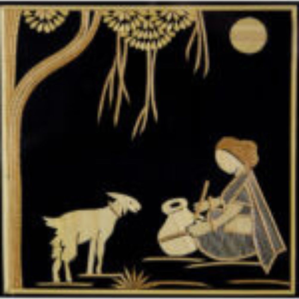 Made using natural Sikki grass, this piece features intricate detailing with golden hues set against a deep black background, creating a striking visual contrast. The artwork is carefully handcrafted by skilled artisans, ensuring each piece is unique and full of character.