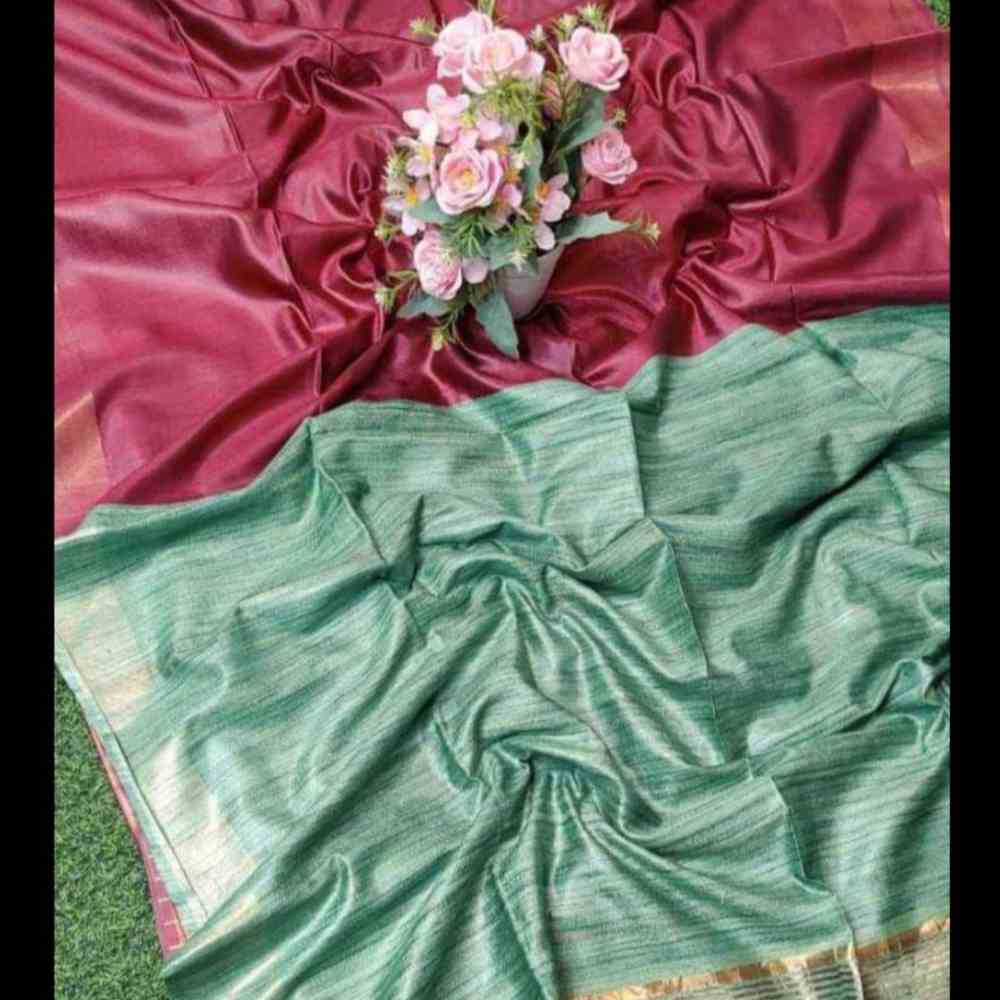 Crafted from exquisite tussar silk.rnFeatures a staple jari border for a touch of shimmer and allure.rnDye technique infuses vibrant hues into the silk.rnMeticulously handcrafted to perfection.rnEmbodies timeless elegance and sophistication.rnElevates your wardrobe with grace and opulence.Also blouse included approx 1meter. dispatch in 15-30 days