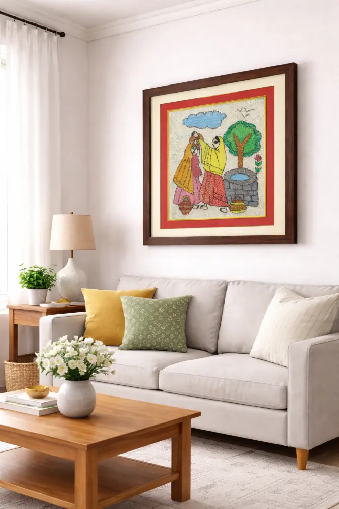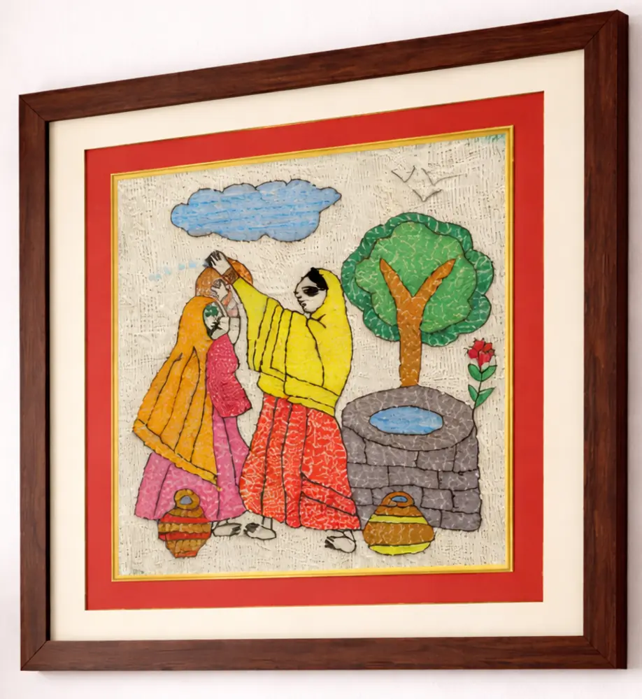 This framed Sujani painting is handcrafted by artisans from Bihar using traditional embroidery techniques. Depicting women engaged in daily village life near a well, it reflects connection, simplicity, and cultural richness. Each piece is intricately hand-stitched on fabric and set in a premium wooden frame, blending heritage storytelling with lively home décor.