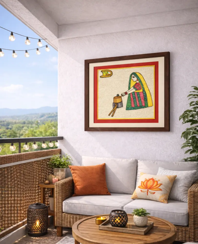 This framed Sujani painting is handcrafted by artisans from Bihar using traditional embroidery techniques. Depicting a woman engaged in traditional cooking, it reflects simplicity, care, and the beauty of everyday rural life. Each piece is hand-stitched on fabric and set in a premium wooden frame, blending cultural storytelling with timeless décor.