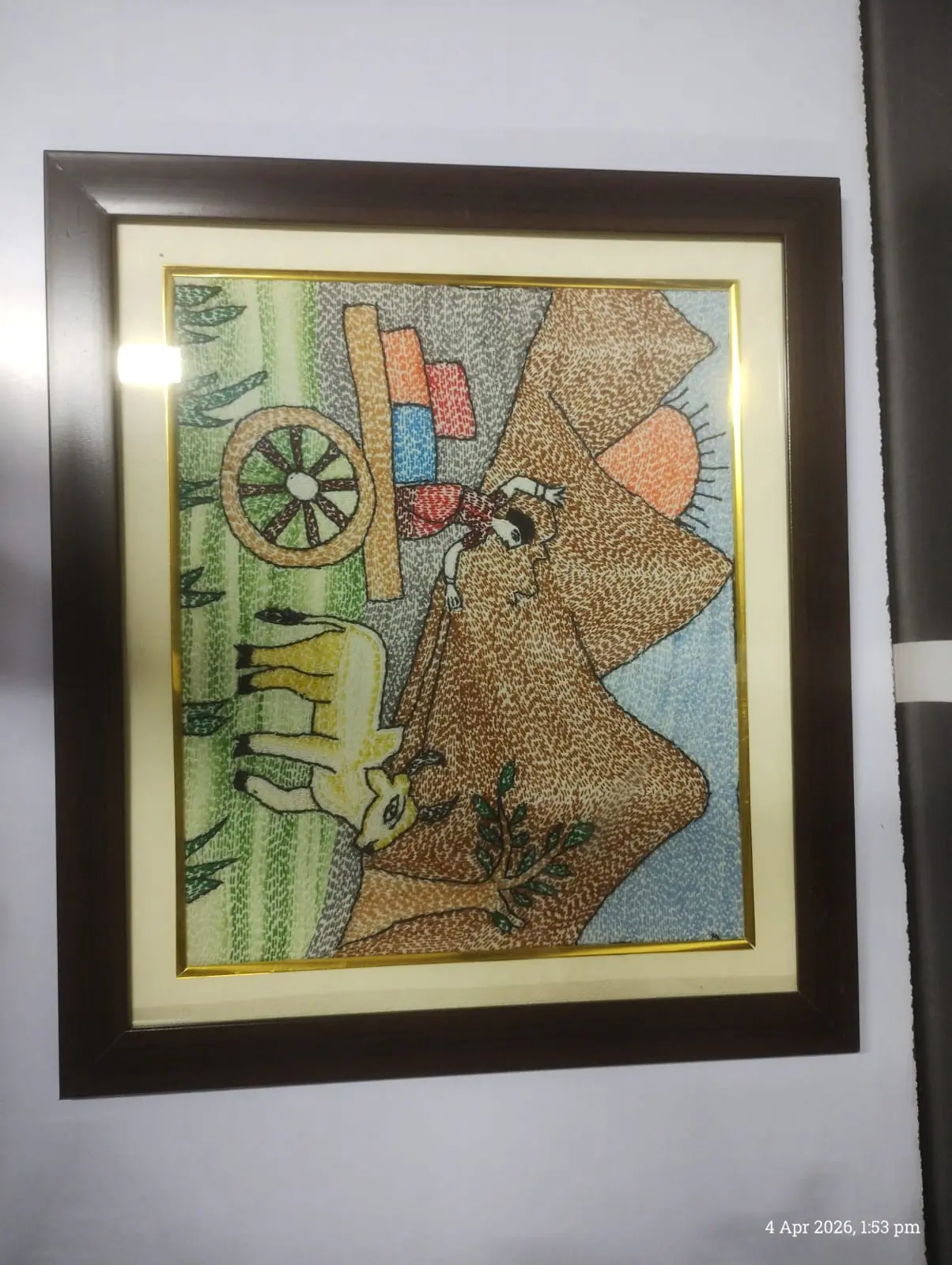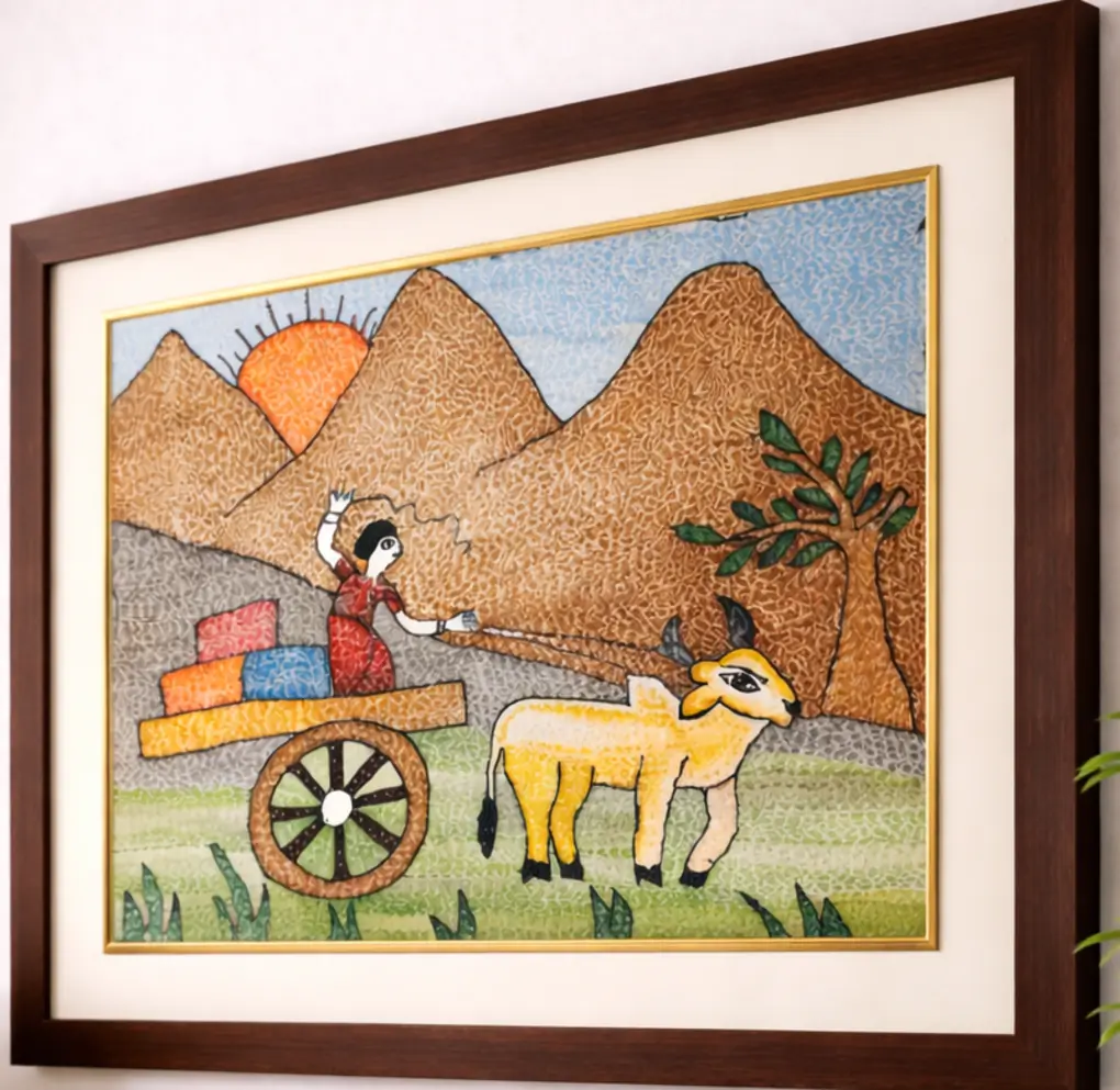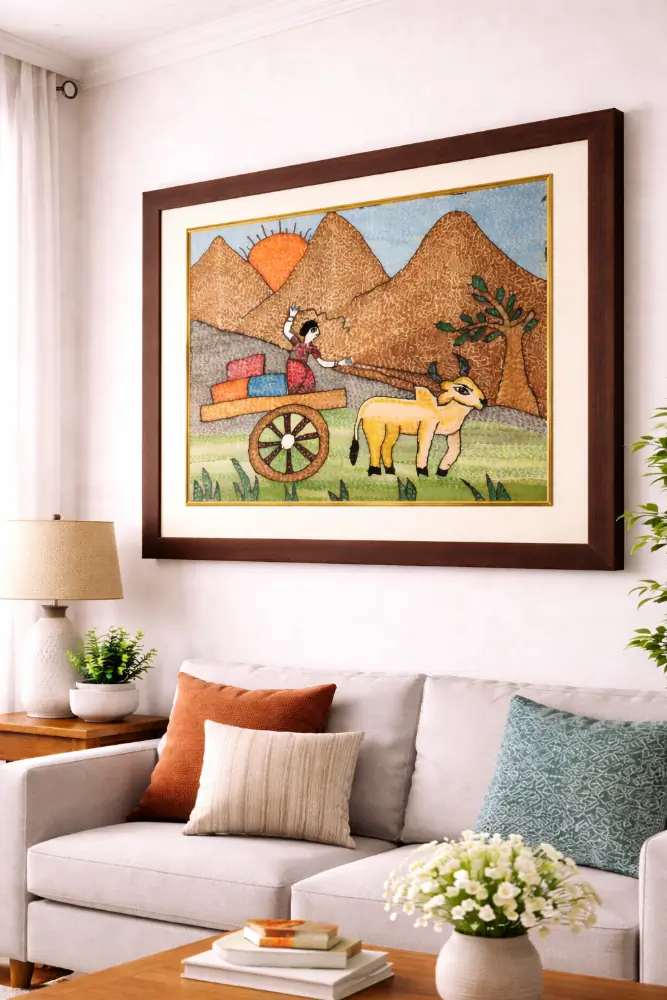 This framed Sujani painting is handcrafted by artisans from Bihar using traditional embroidery techniques. Depicting a village scene with a bullock cart against scenic hills and a rising sun, it reflects simplicity, hard work, and rural harmony. Each piece is carefully hand-stitched and framed, blending heritage craft with timeless storytelling.