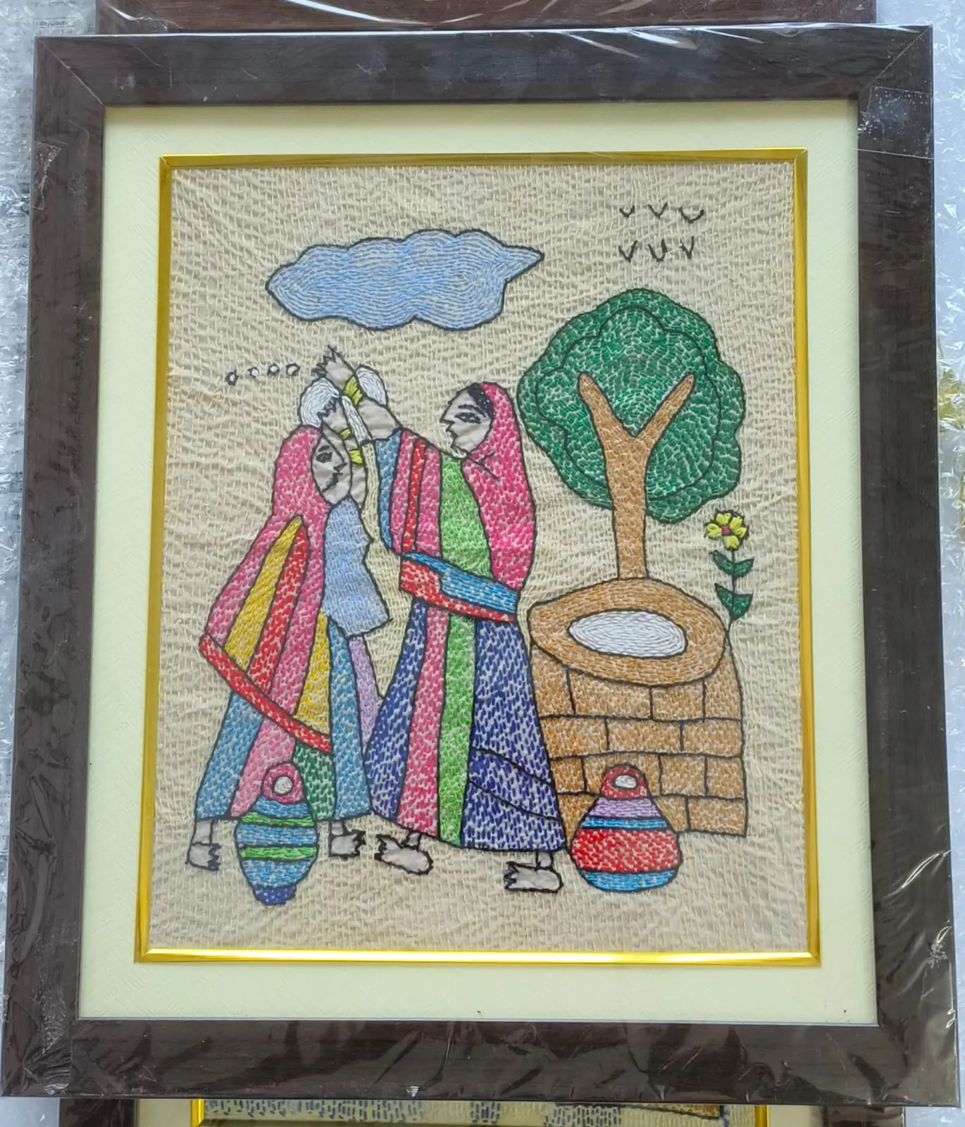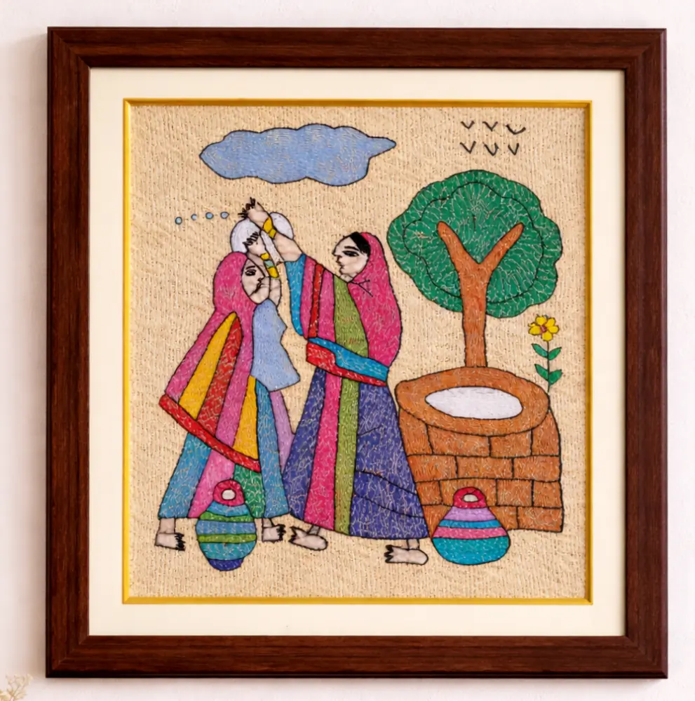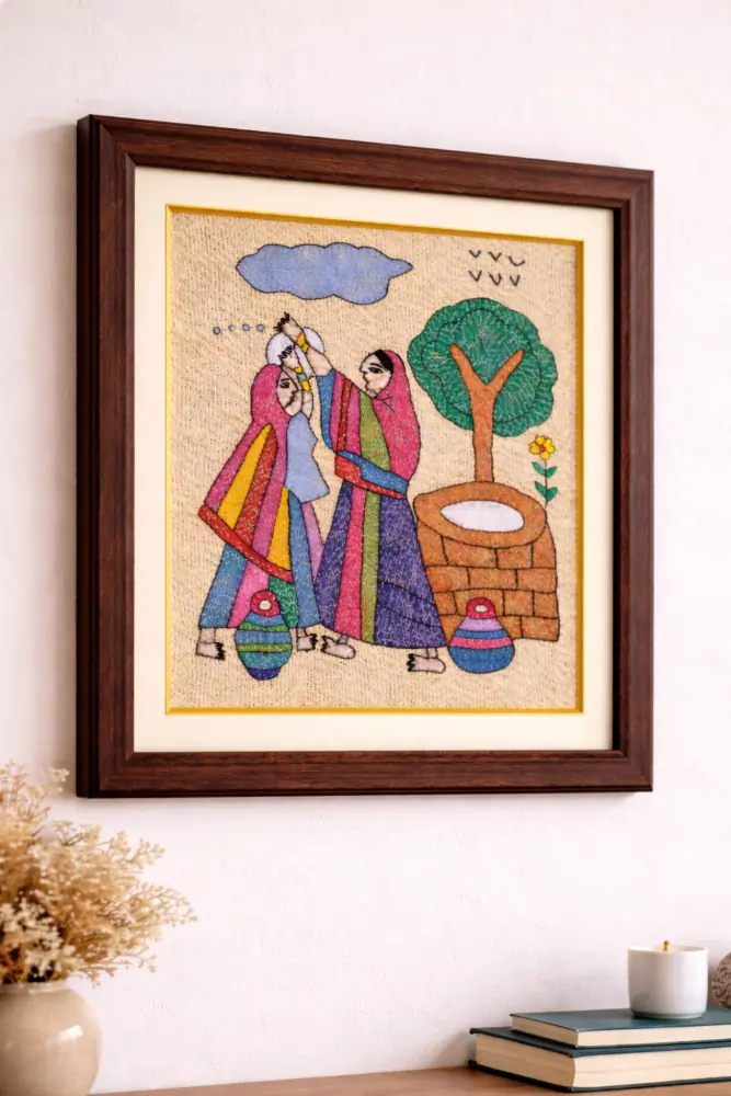 This framed Sujani painting is handcrafted by artisans from Bihar using traditional embroidery techniques. Depicting women sharing a candid moment near a village well, it reflects friendship, daily life, and cultural vibrancy. Each piece is intricately hand-stitched on fabric and set in a premium wooden frame, celebrating heritage craft and storytelling.