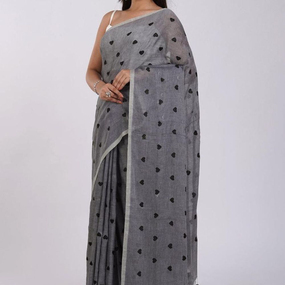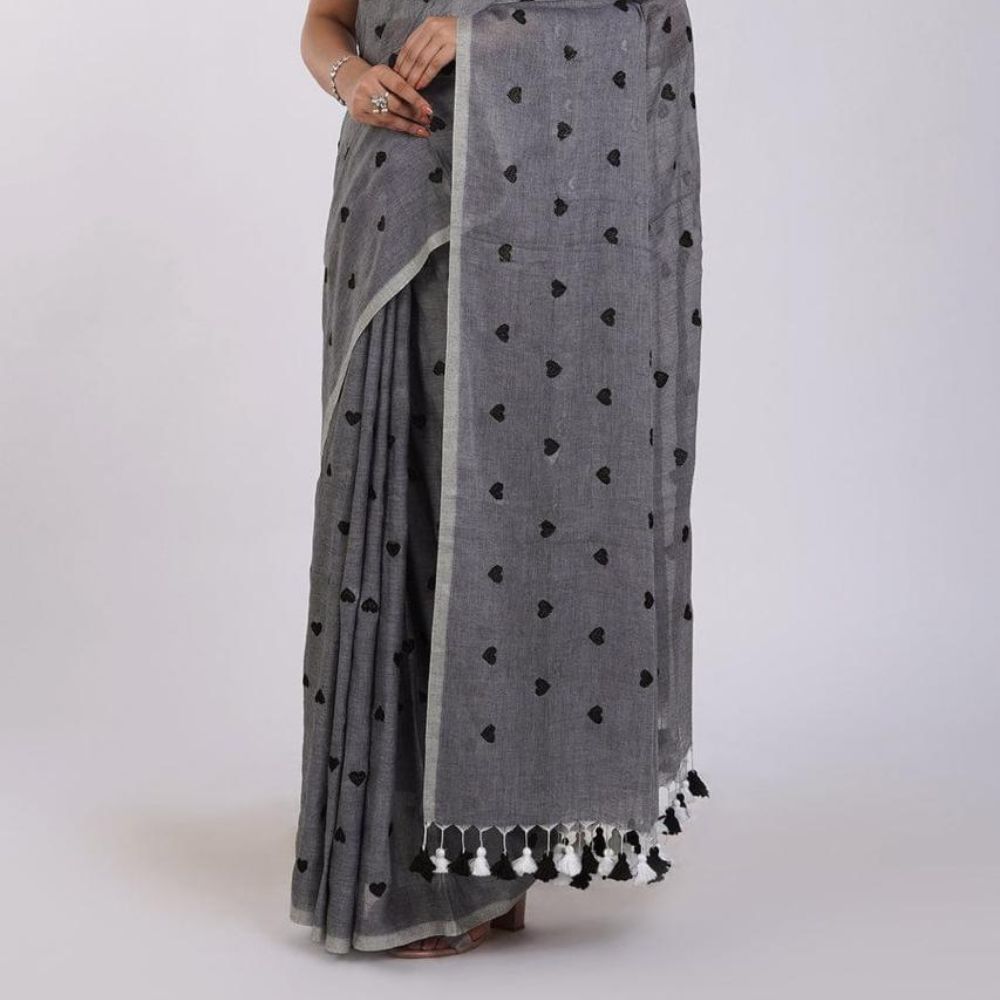 Grey Mul Cotton Saree with Black Hearts