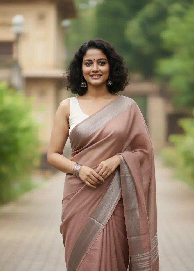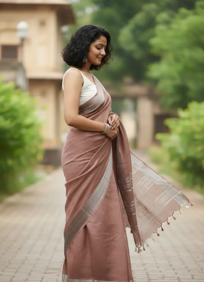 A soft rose-brown handwoven cotton saree with a muted grey border, designed for understated elegance and everyday grace.