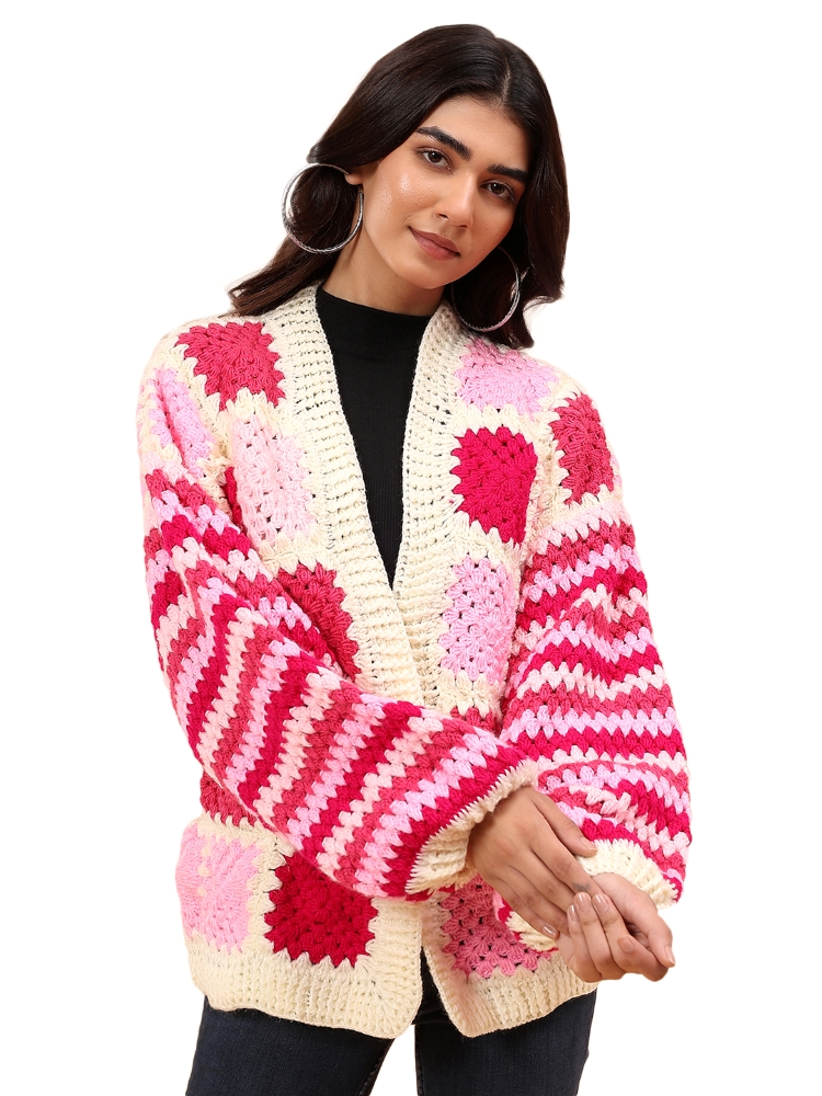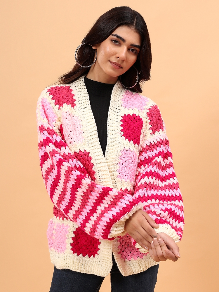 This hand-crocheted cardigan sweater is carefully crafted by skilled artisans using traditional crochet techniques. The pink and cream color palette with bold granny-square motifs reflects a playful yet timeless aesthetic. Soft, warm, and breathable, this sweater is perfect for layering during winters and adding a handcrafted statement to everyday outfits.