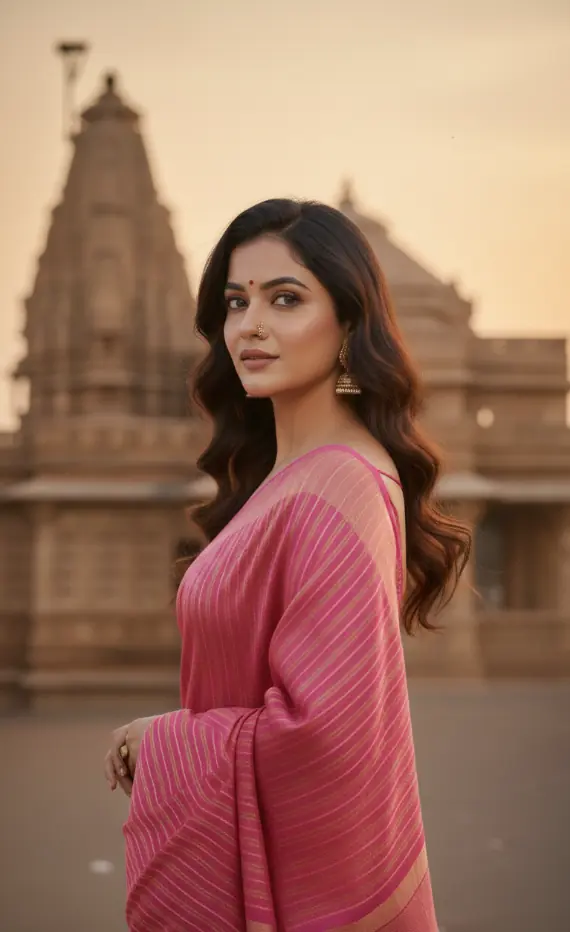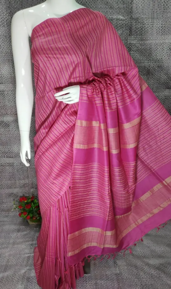 This handwoven cotton saree is crafted by skilled artisans from Telangana using traditional pit-loom weaving techniques. The vibrant rose pink base is enhanced with soft golden-beige stripes and borders, symbolising warmth and celebration. Perfect for festive mornings, cultural occasions, and elegant daytime wear, each saree is slowly woven on heritage looms for authentic handloom charm.