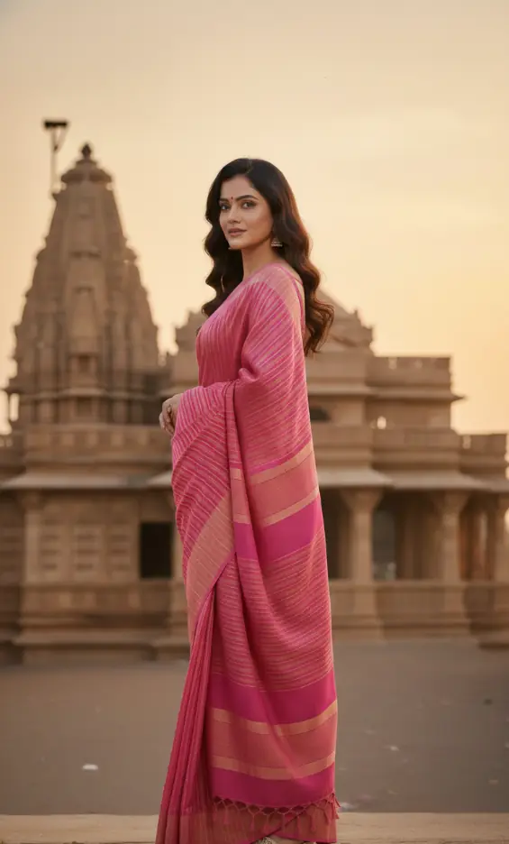 A luminous handwoven cotton saree in rich rose pink with warm golden-beige accents, designed for breathable comfort and graceful festive elegance.