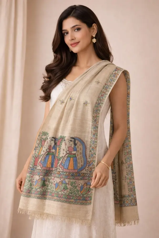 ??Elevate your ethnic and contemporary wardrobe with this exquisite Hand-Painted Ghicha Silk Stole, featuring intricate Madhubani artwork. Every stroke on this stole reflects the rich heritage of Mithila artisans, making it a masterpiece of tradition and craftsmanship.