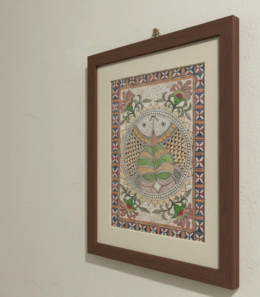 This Madhubani painting beautifully captures the essence of traditional Mithila art, featuring a mesmerizing depiction of two fish symmetrically arranged around a sacred Pipal leaf. The fish, a symbol of prosperity and good luck, are intricately designed with fine detailing and earthy tones, enhancing the visual depth of the artwork. The central Pipal leaf, revered in Indian culture, represents longevity and spiritual growth.