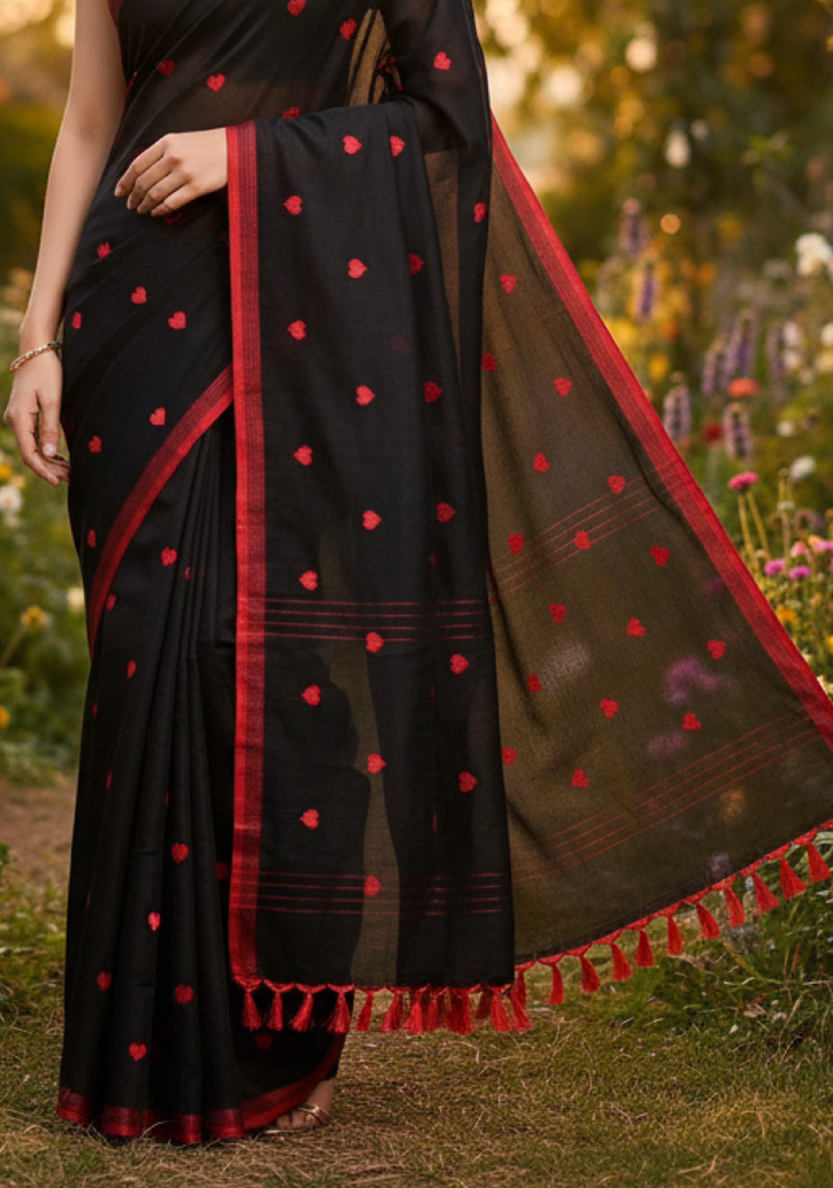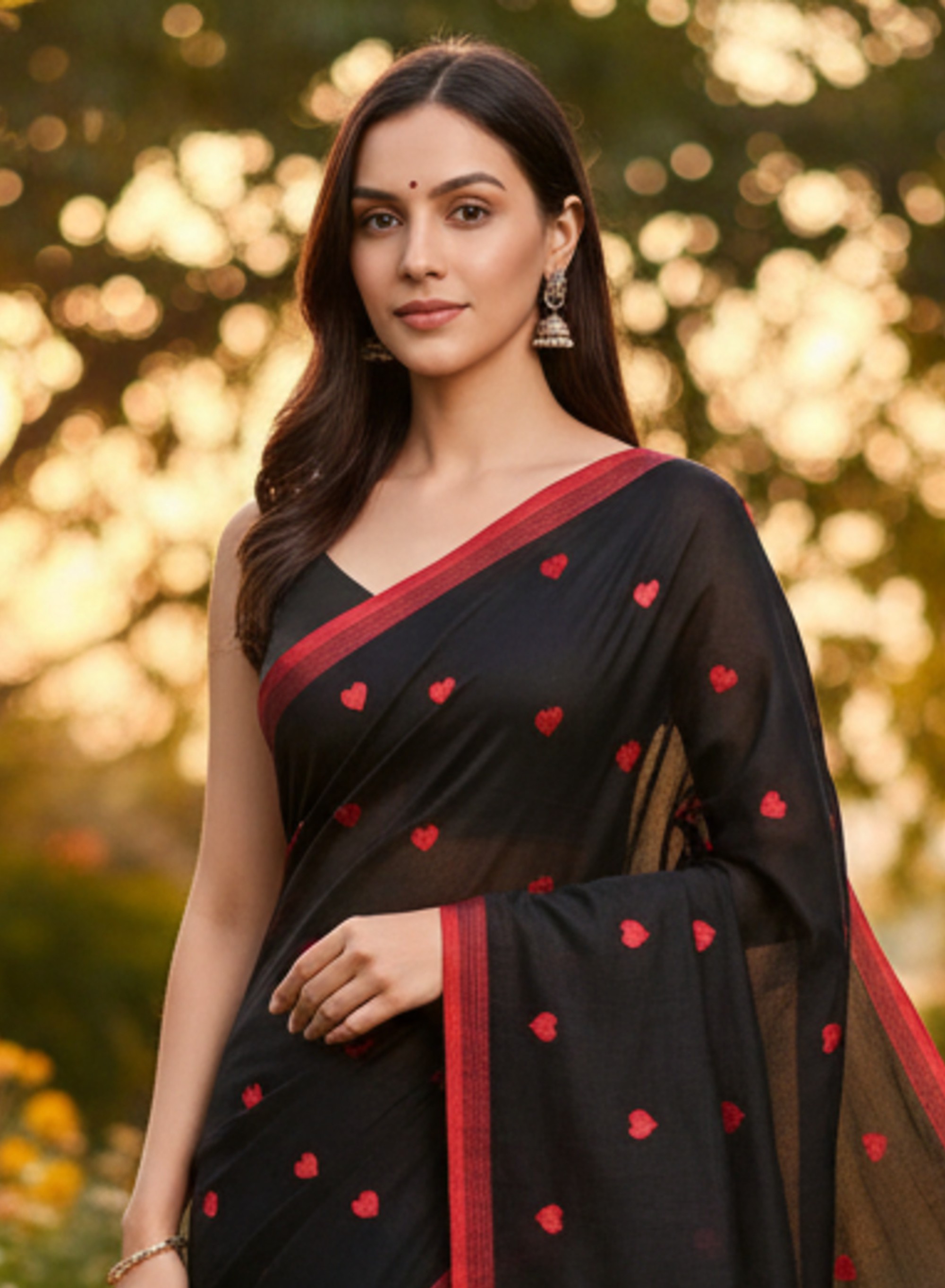 Add a touch of elegance and charm to your wardrobe with this mul cotton saree in a soothing serene blue shade. Designed for ultimate comfort and style, this saree features beautifully embroidered red heart motifs, creating a striking contrast.