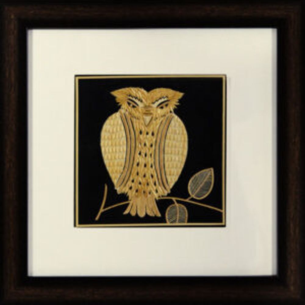 The composition showcases a regal owl perched on a delicate branch, with intricately designed feathers and expressive eyes that bring the artwork to life. The natural golden hue of Sikki grass contrasts beautifully against the black background, enhancing the depth and detail of the piece.