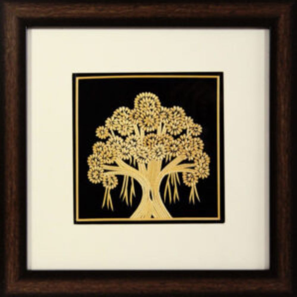 The design showcases a beautifully structured banyan tree with intricate branches and hanging aerial roots, crafted meticulously from golden Sikki grass on a contrasting black background. The tree, revered in Hindu and Buddhist traditions, represents eternal life, knowledge, and spiritual growth.