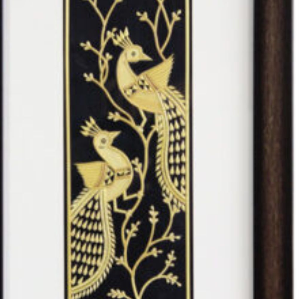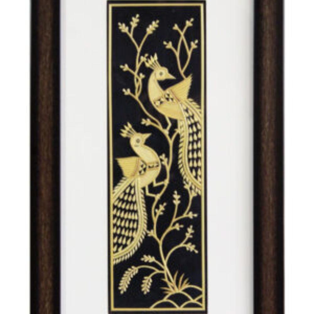 The detailed artwork captures two peacocks with elaborate plumage, symbolizing grace, beauty, and prosperity. Set against a deep black background, the shimmering golden Sikki grass creates a captivating contrast, highlighting the intricate patterns of the birds’ feathers and the delicate branches.