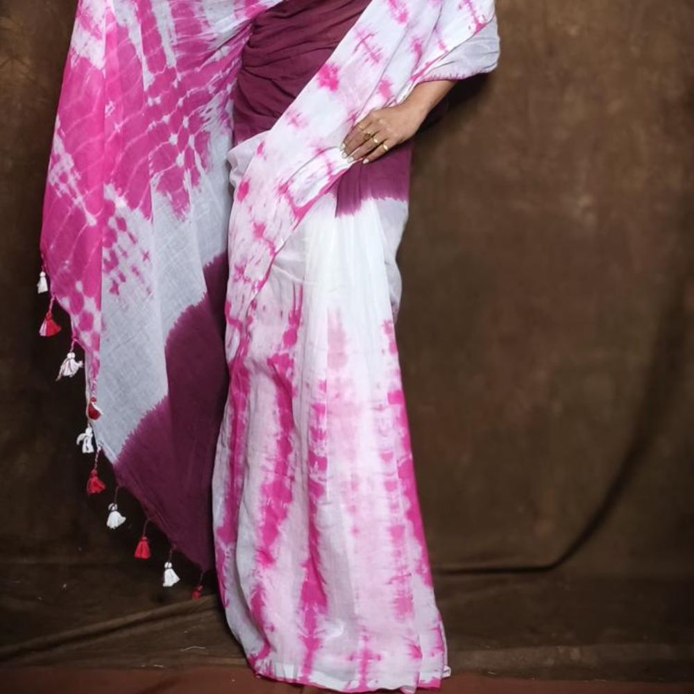 Step into elegance with this beautifully handcrafted cotton saree, featuring a mesmerizing blend of deep wine and vibrant pink tie-dye patterns. The rich wine-colored pallu exudes sophistication, while the soft white base with striking pink tie-dye adds a refreshing, artistic appeal. Crafted from lightweight and breathable cotton, this saree is perfect for festive occasions, casual outings, and cultural celebrations.