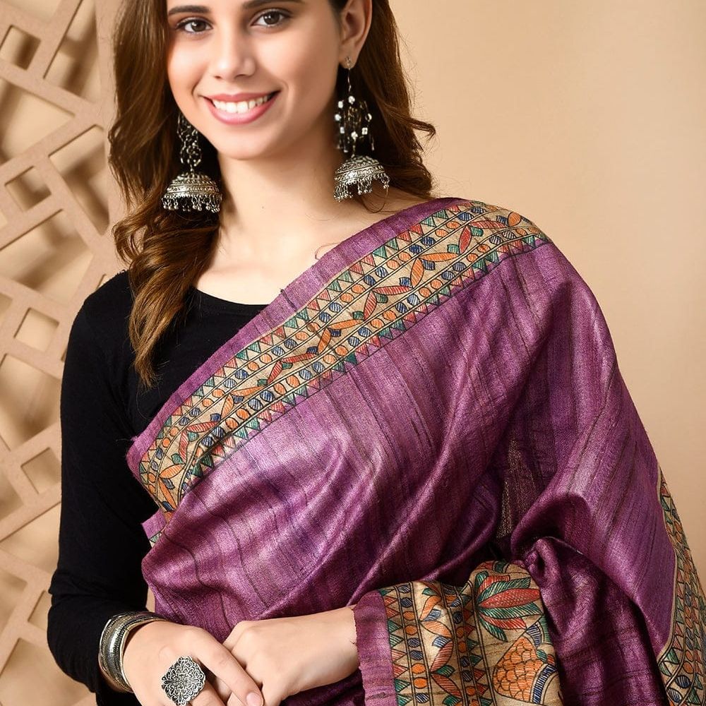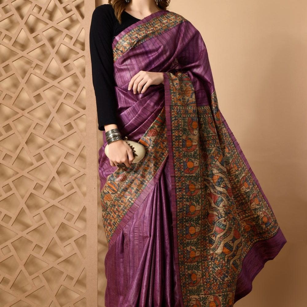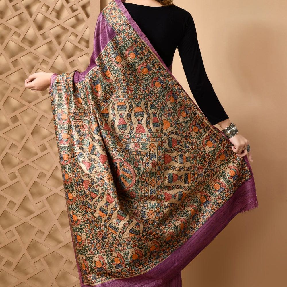 Handcrafted Madhubani Tussar Silk Purple Colour Saree
