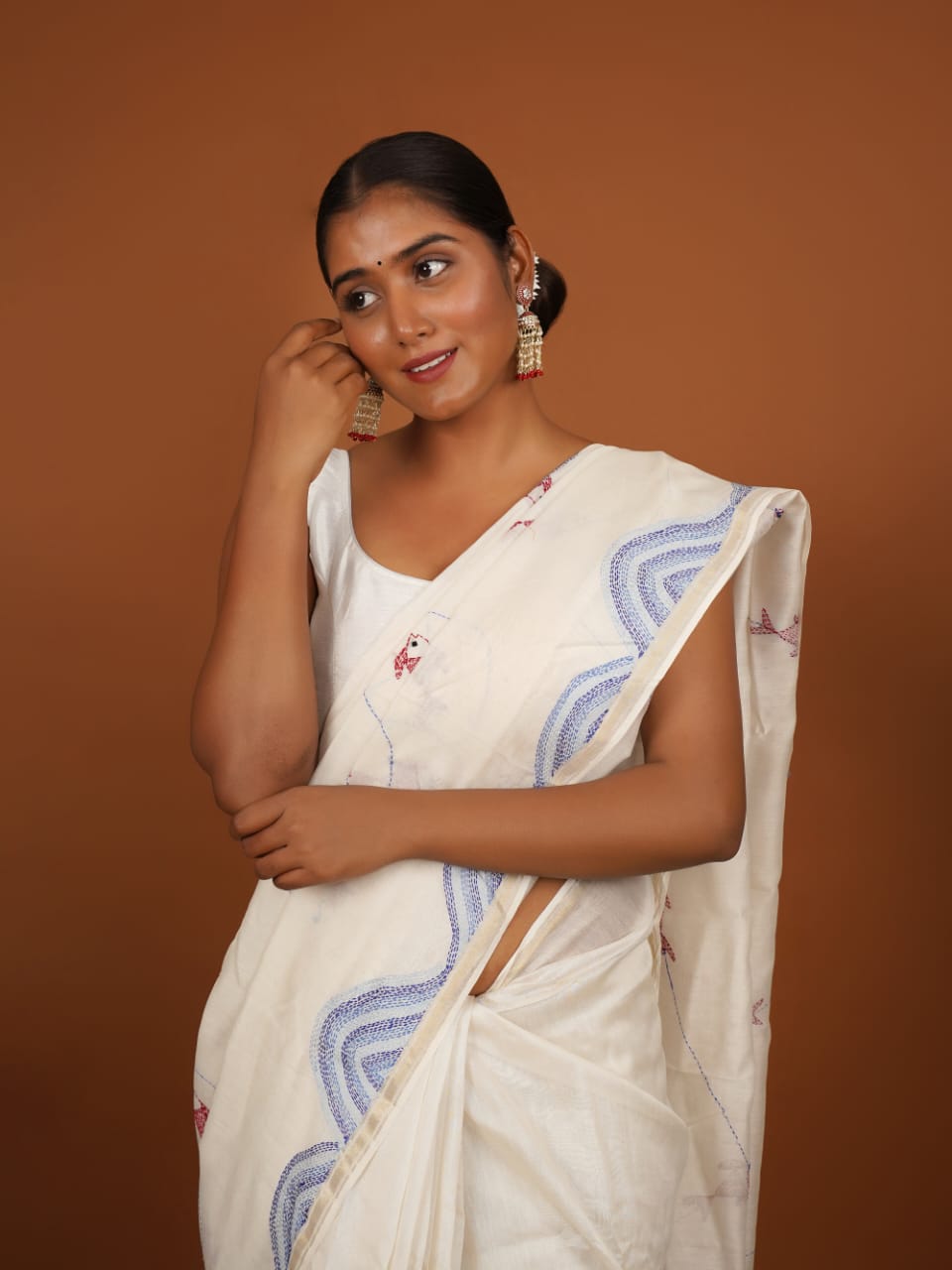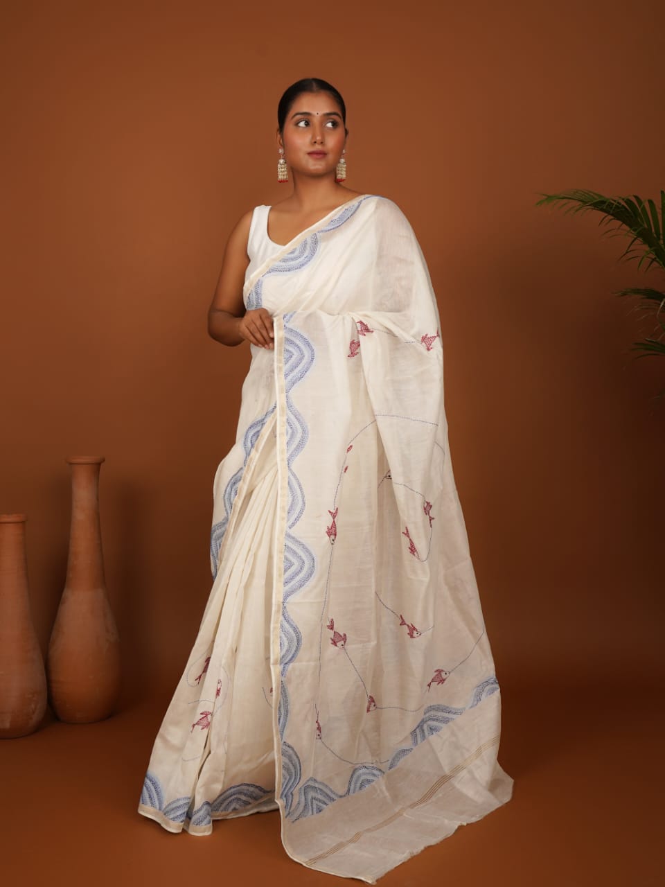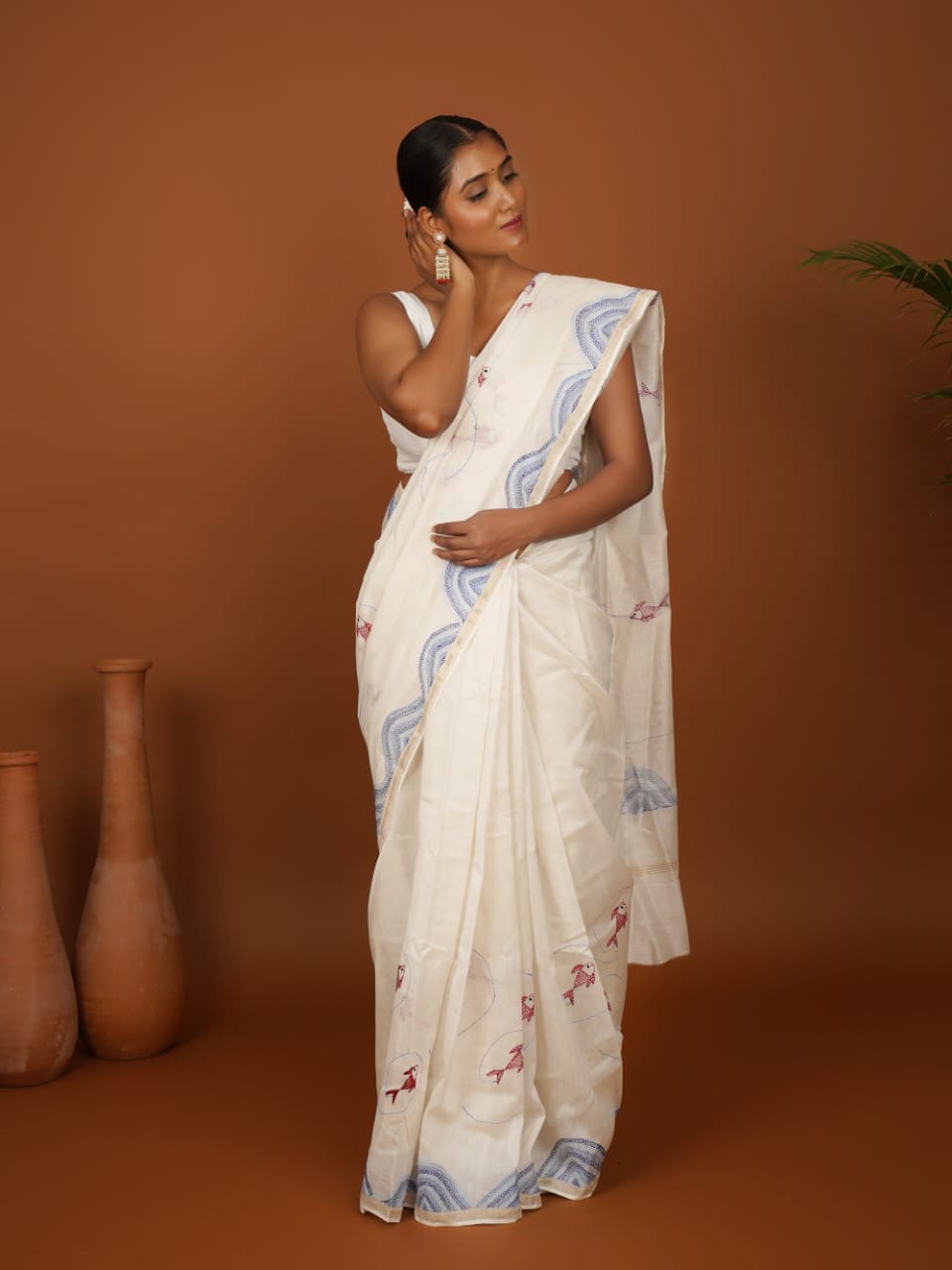 Handloom Off-White Cotton Saree - Bihar Embroidered Fish & Blue Threadwork