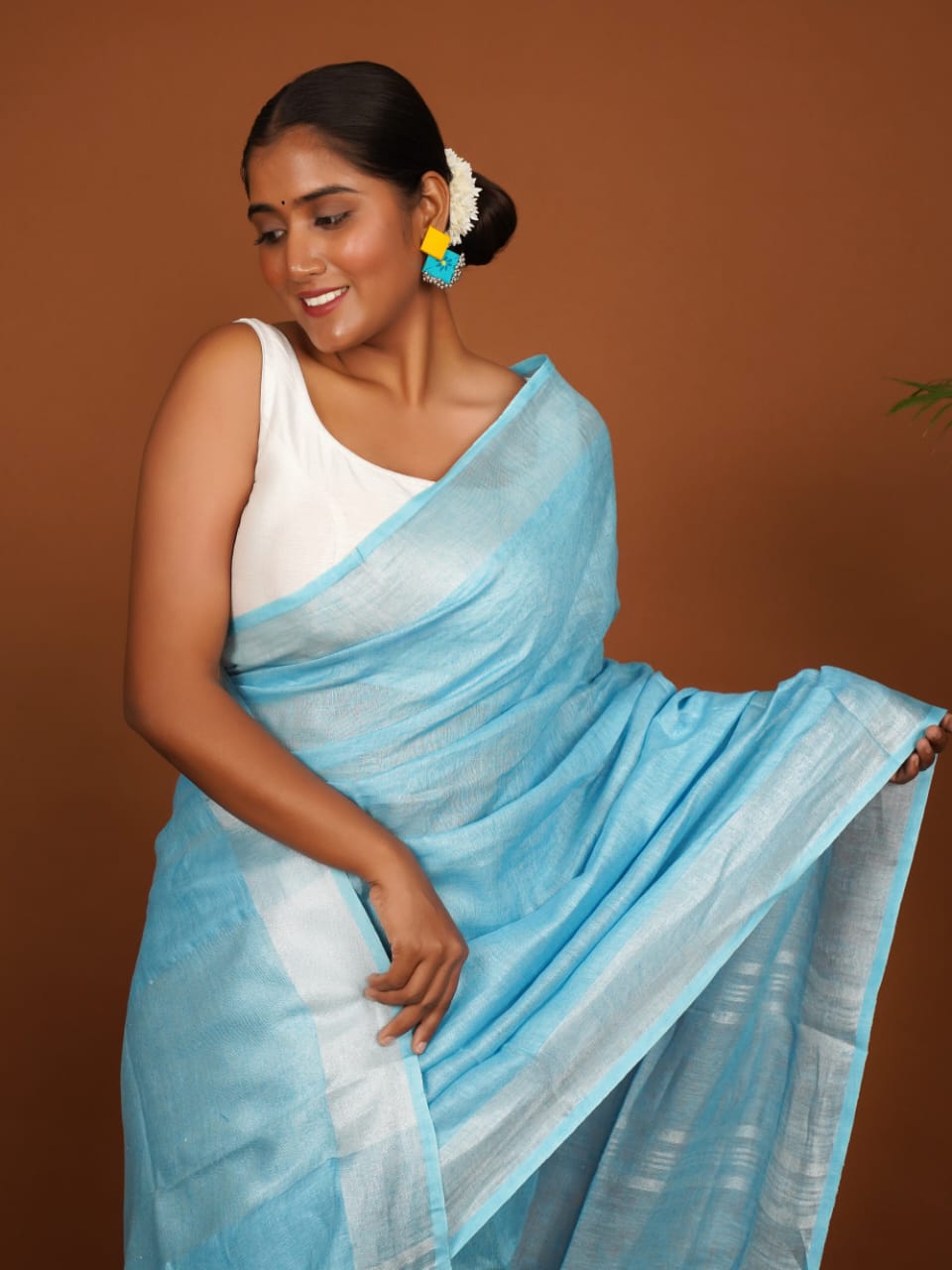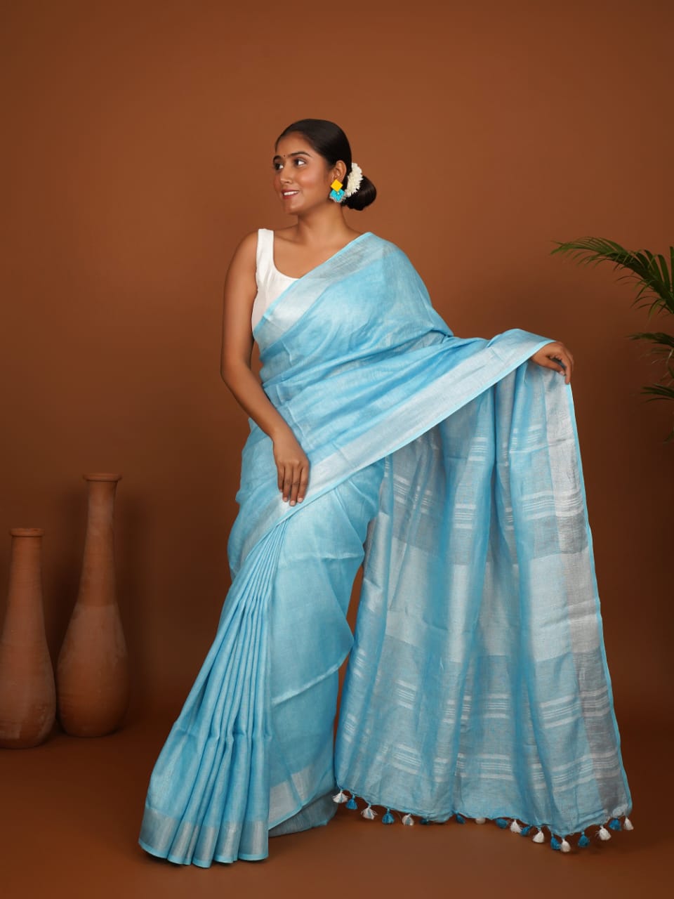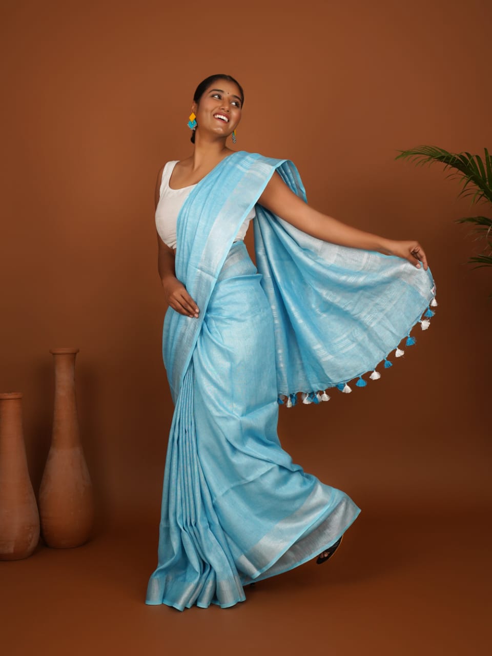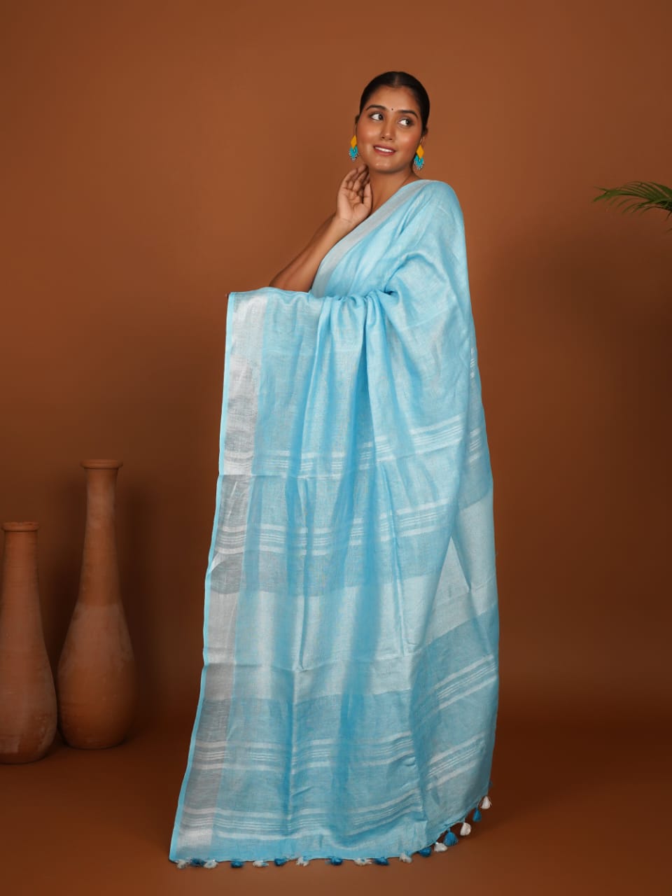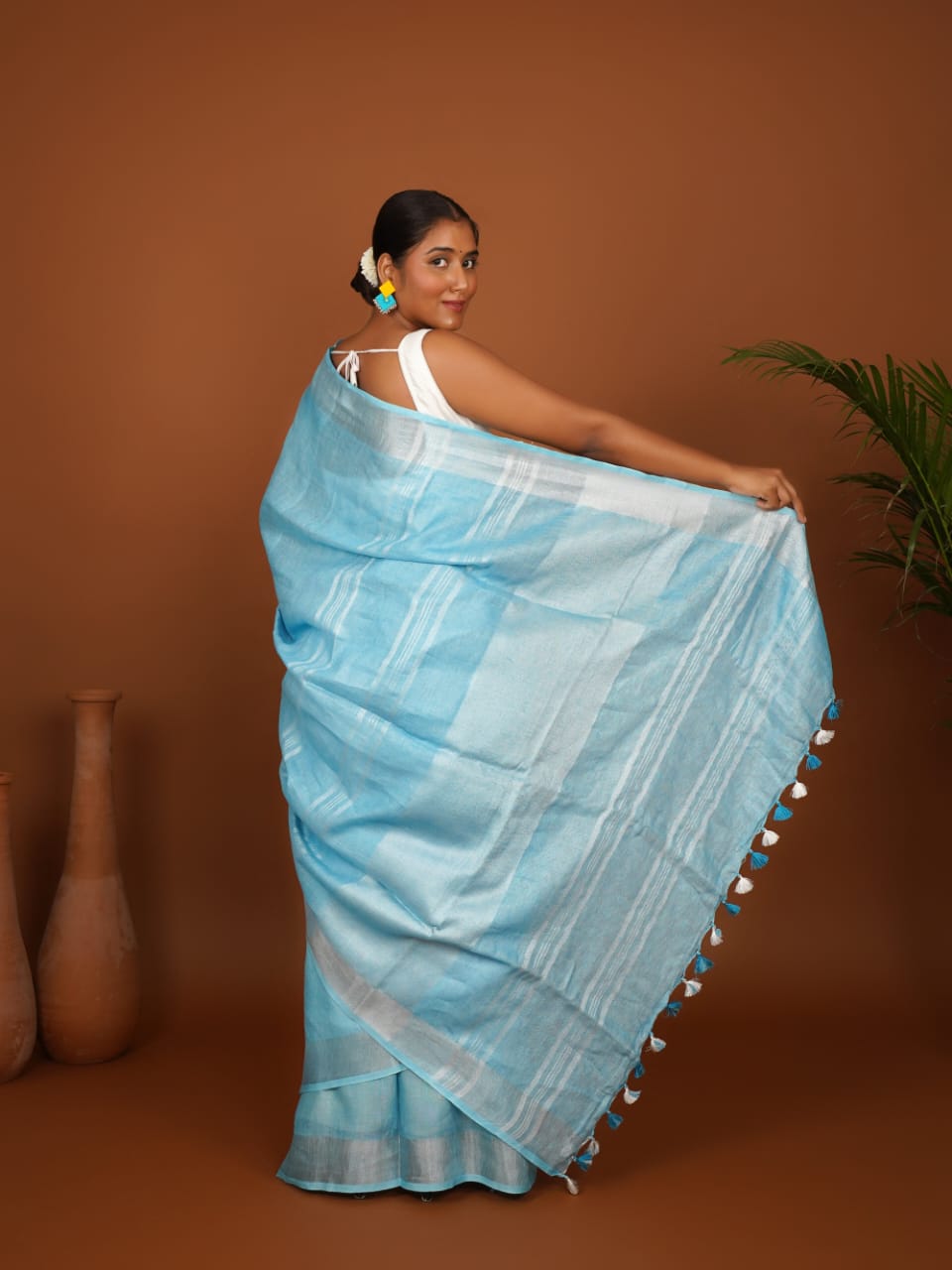 Handloom Sky Blue Linen Saree - Bihar Artisan Crafted with Tassels