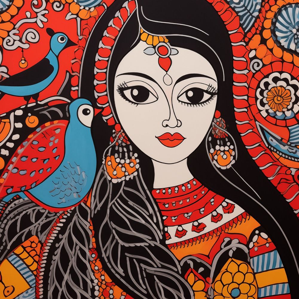 • Subject: A beautifully adorned woman with expressive eyes, surrounded by colorful birds and intricate floral motifs