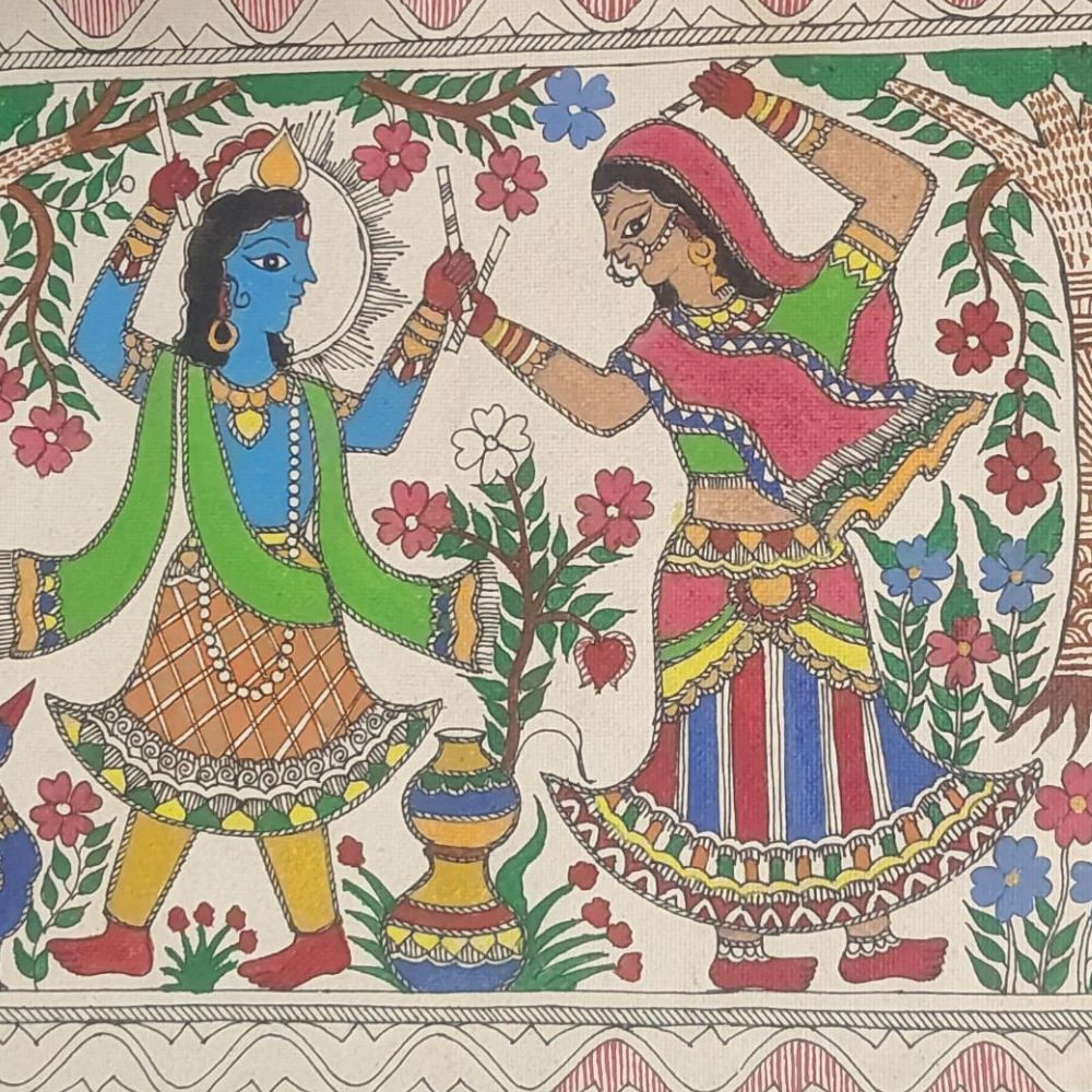 Handmade Madhubani Painting  Krishna and Radha Playing Raas Leela