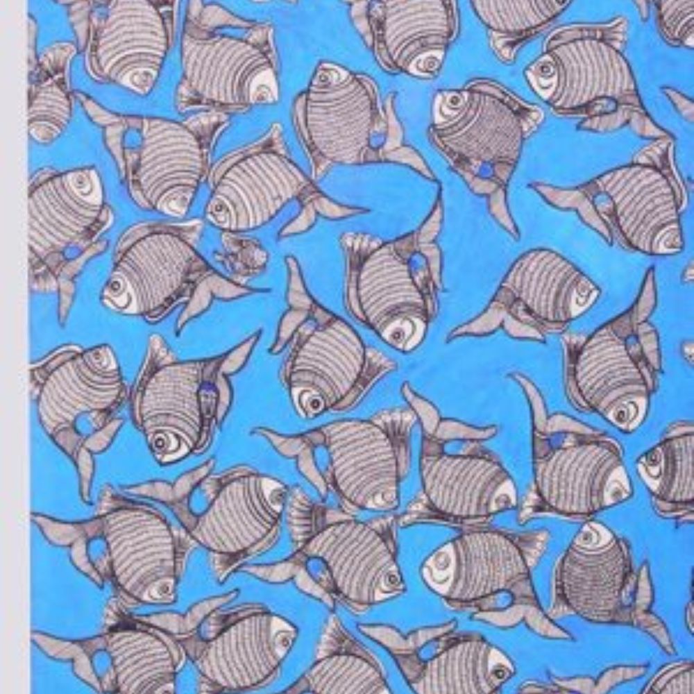 This Madhubani painting is a stunning representation of fish in rhythmic motion, symbolizing prosperity, abundance, and the continuous flow of life. The intricate black-and-white fish motifs stand out beautifully against the vibrant blue background, creating a mesmerizing visual effect. This artwork perfectly embodies the precision and artistic excellence of the Kachni (fine-line) style in Mithila art.