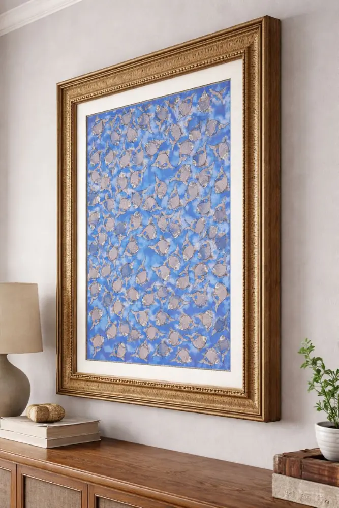 In Madhubani art, fish symbolize luck, fertility, and abundance. Their flowing movement reflects positivity and the continuous cycle of life. The striking blue backdrop represents water, tranquility, and depth, making this artwork a perfect addition to both modern and traditional interiors.