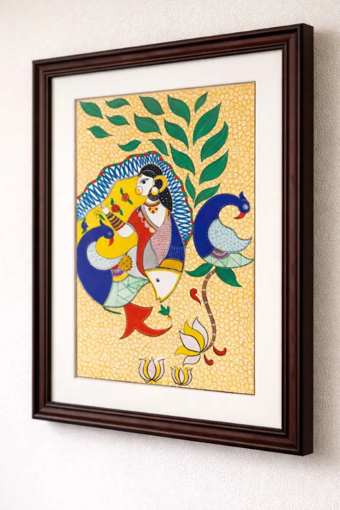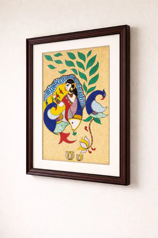 Handmade Madhubani Painting – Woman with Peacocks and Fish
