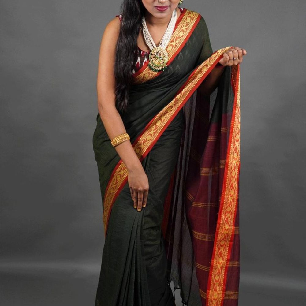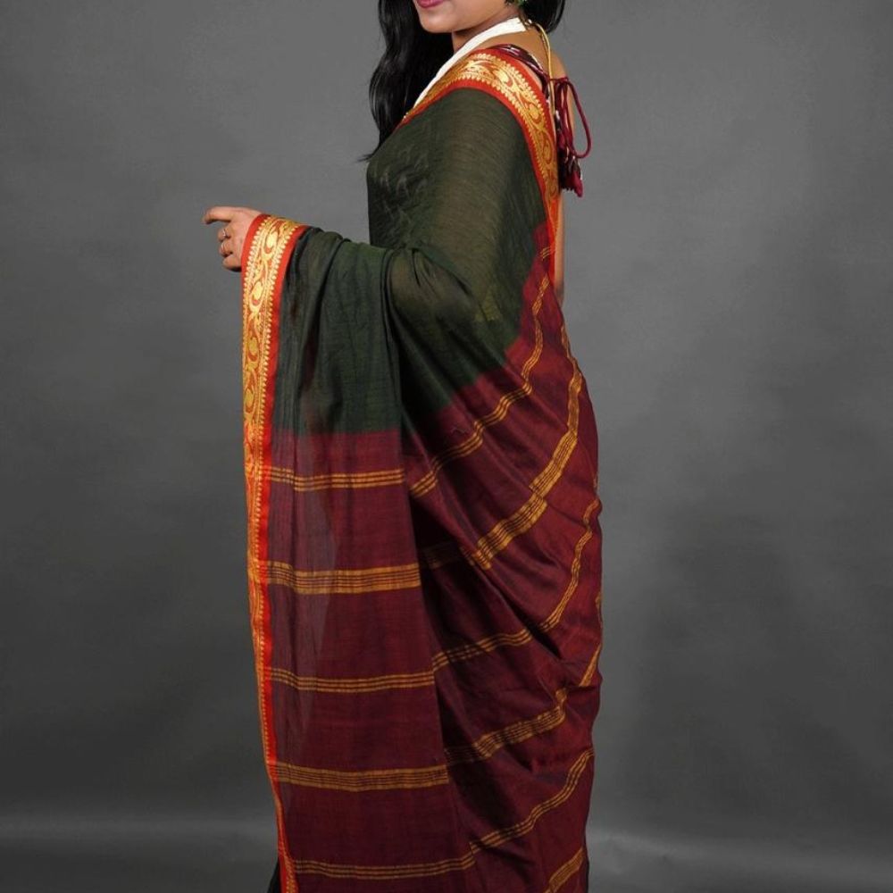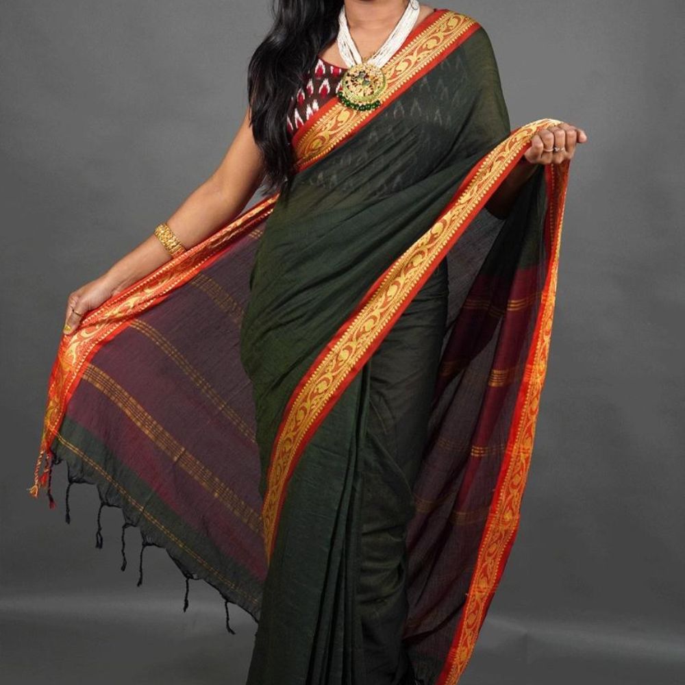 Exude timeless elegance with this handwoven Dark Green saree featuring a vibrant orange and gold border. The rich Green base beautifully contrasts with the intricate detailing on the border, making it a versatile choice for festive celebrations, formal occasions, or evening wear. Lightweight and easy to drape, this saree combines style and comfort effortlessly. Pair it with statement jewelry to complete your striking ensemble.