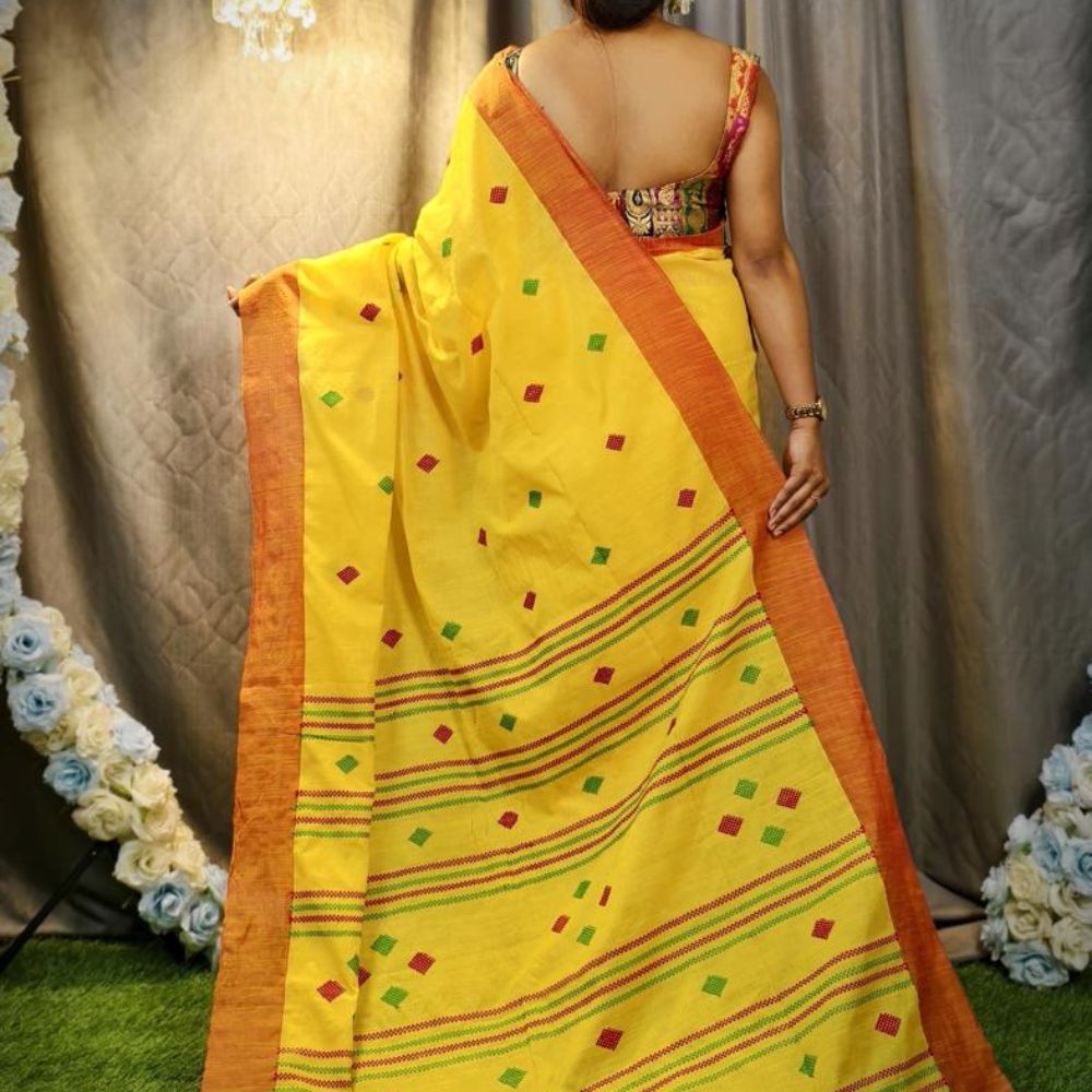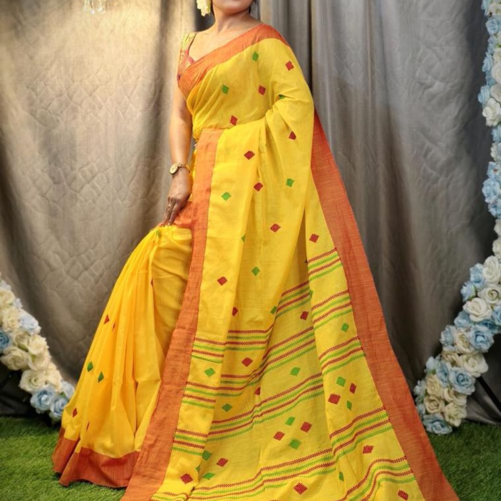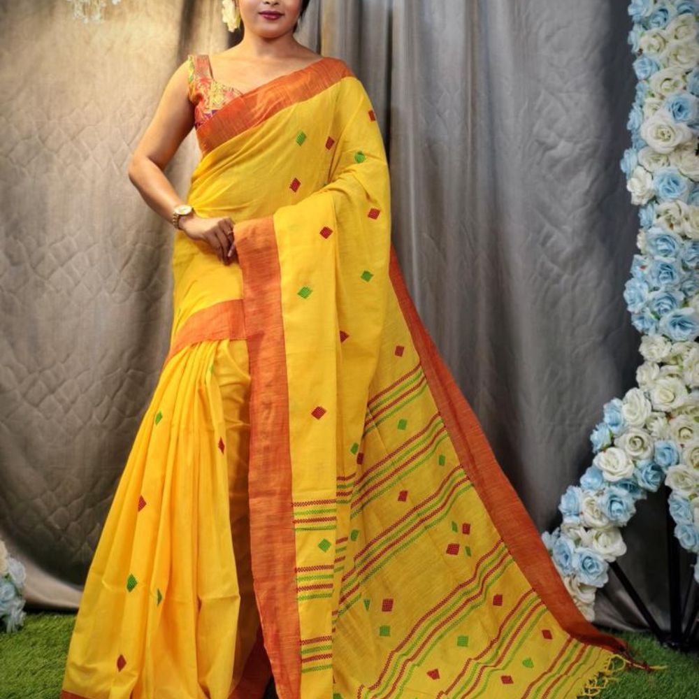 Handwoven Cotton Tangail Saree Yellow with Rust Border