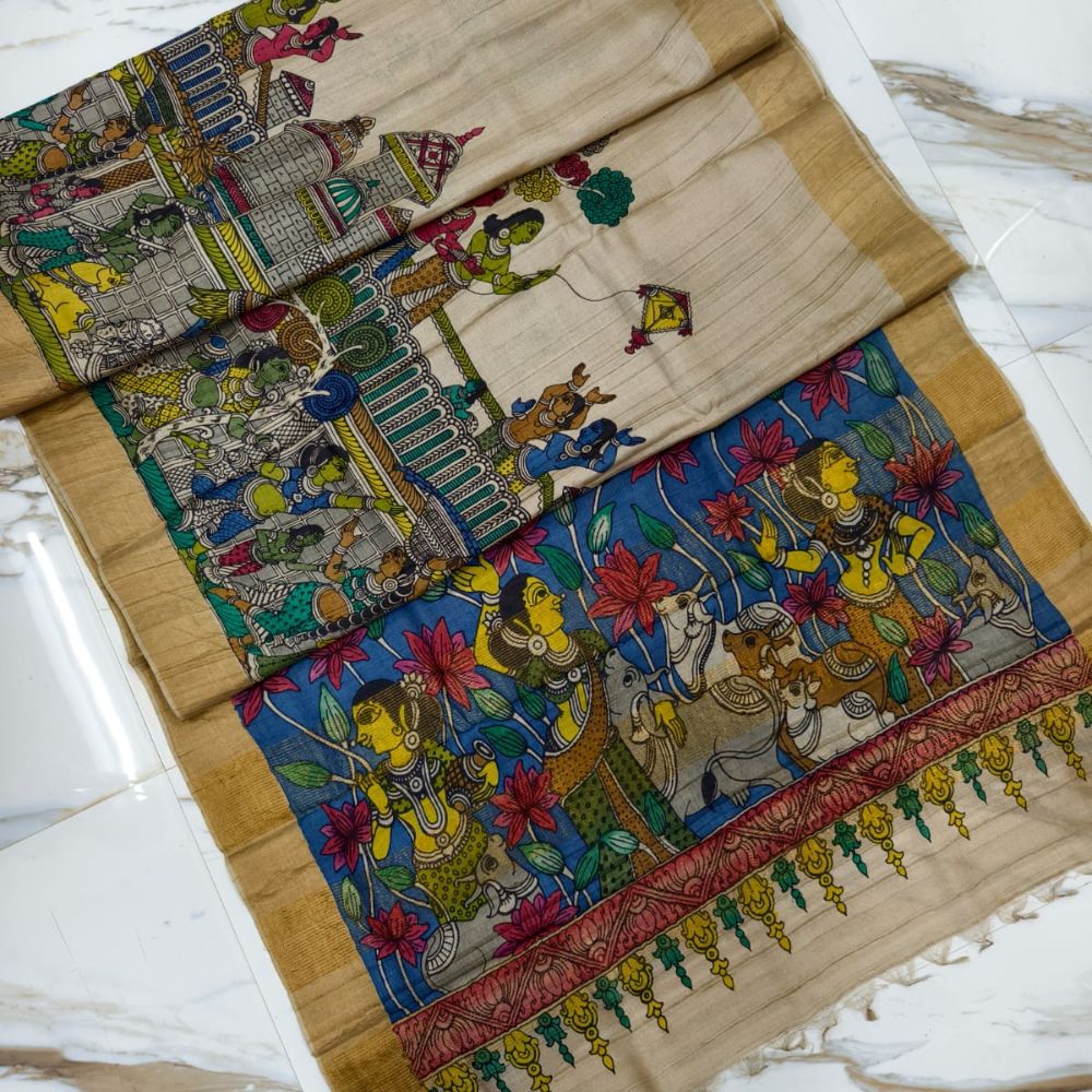 kalamkarii hand-painting, an ancient folk art from Bihar, showcasing mythological figures, floral vines, and nature-inspired motifs. The beautifully detailed artwork on the pallu narrates cultural tales, while the subtle yet artistic patterns on the body enhance its aesthetic charm.