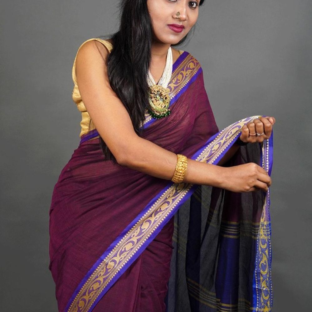 Radiate elegance with this exquisite handwoven purple saree, featuring a rich blue and gold border. The deep purple base exudes sophistication, while the intricate blue and gold detailing adds a regal charm. Perfect for festive celebrations, formal gatherings, or evening occasions, this saree combines comfort with timeless style. Lightweight and easy to drape, it’s a versatile choice for any wardrobe.