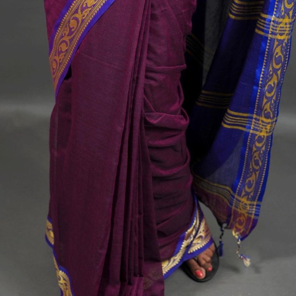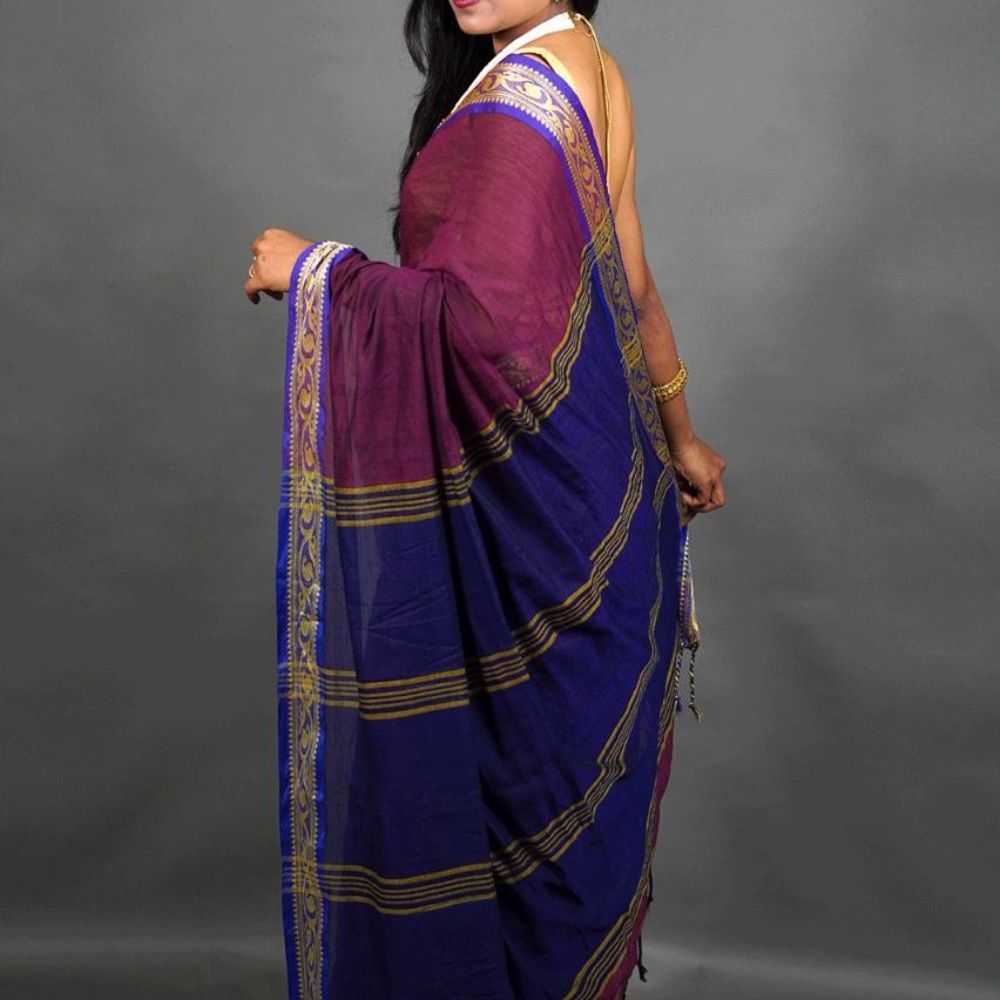 Handwoven purple Saree with blue and Gold Border
