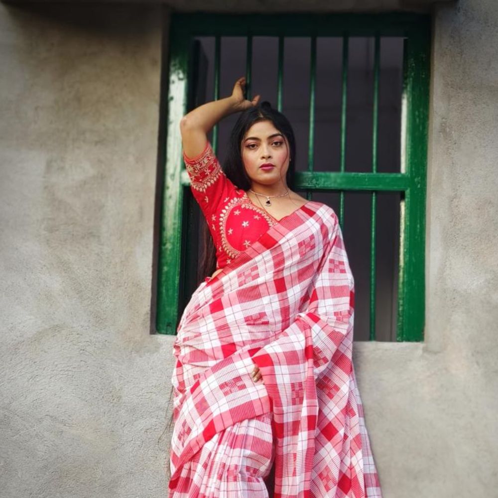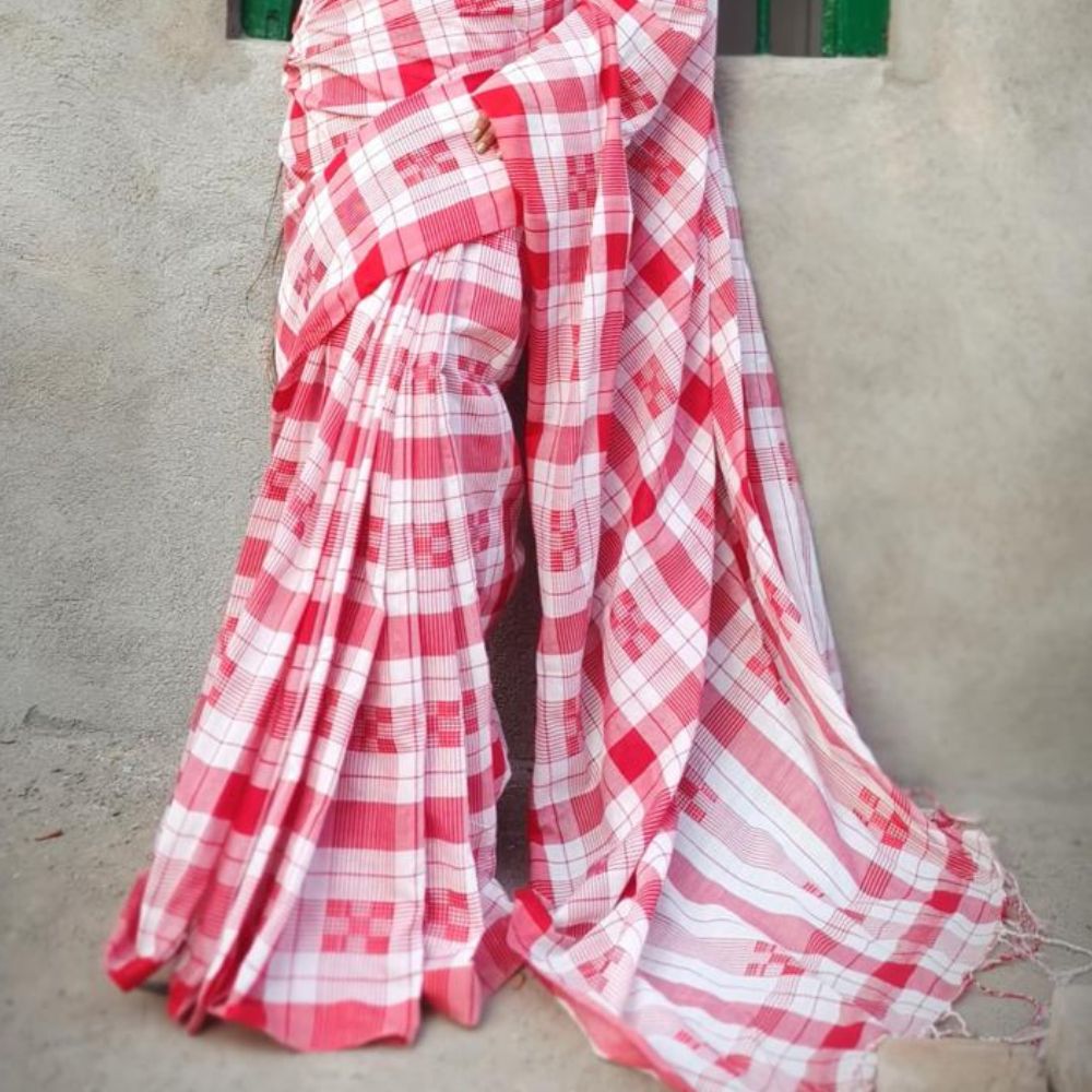 Elegantly crafted with a timeless red and white checkered design, this handwoven cotton saree is a perfect blend of tradition and comfort. The soft, breathable fabric ensures all-day wearability, while the intricate handwork on the blouse adds a touch of sophistication. Ideal for casual outings, festive gatherings, or workplace attire, this saree embodies grace and charm.