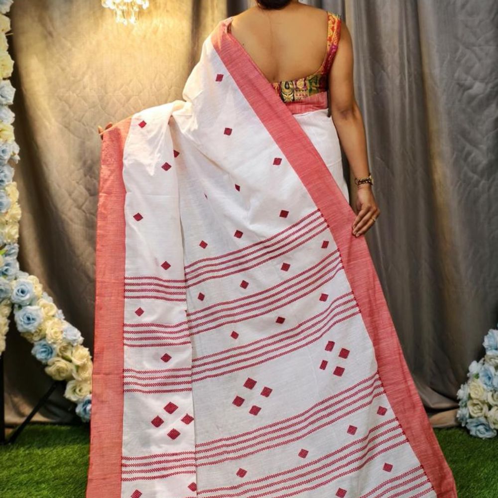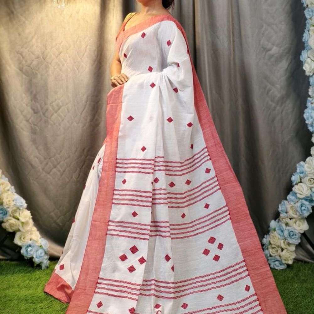 Drape yourself in the timeless elegance of this Handwoven Tangail Cotton Saree, a perfect blend of grace and tradition. The pristine white base is adorned with delicate red woven motifs, creating a striking contrast that enhances its beauty. The soft red border and intricately woven patterns on the pallu add a touch of heritage craftsmanship, making it an ideal choice for festive occasions, cultural events, and everyday sophistication.