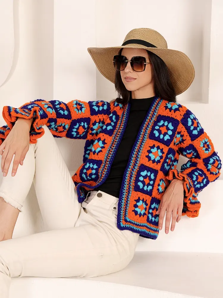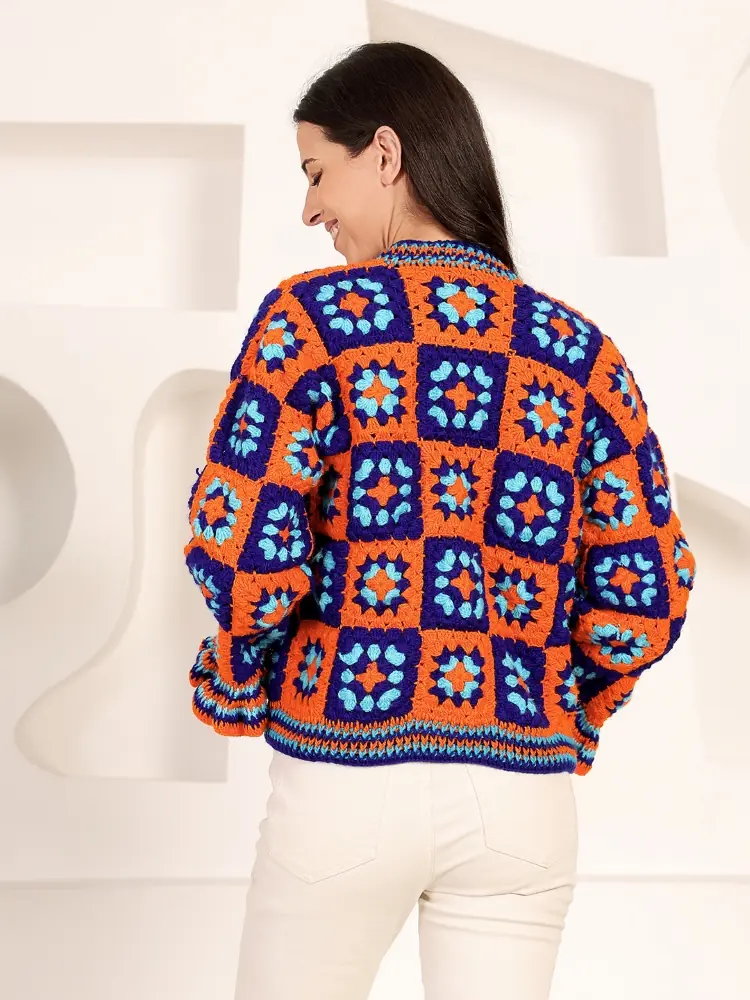 This handcrafted crochet sweater is made by skilled artisans using traditional hand-crochet techniques and soft yarns. The bold geometric granny-square motifs in rich orange, blue, and turquoise tones celebrate creativity and individuality. Carefully handcrafted stitch by stitch, it is perfect for conscious fashion lovers who value comfort, warmth, and artisanal design.