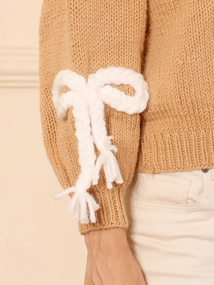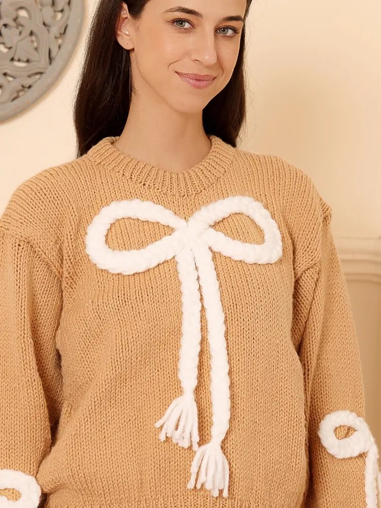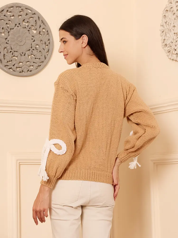 This handcrafted knit sweater is created by skilled artisans using traditional hand-knitting techniques. The warm camel base is elevated with delicate ivory bow and tassel detailing, adding a soft, feminine charm. Designed for comfort and statement styling, each piece carries subtle variations that celebrate slow, handmade fashion.