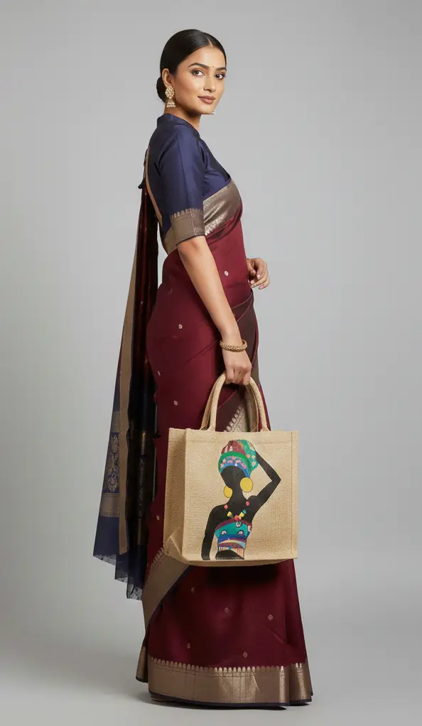 The NrityaShakti Handcrafted Jute Tote Bag draws inspiration from tribal dance forms that honour strength, rhythm, and resilience. Hand-painted by artisans, the striking silhouette motif on natural jute reflects stories of community, celebration, and rooted femininity making this tote both functional and deeply expressive.