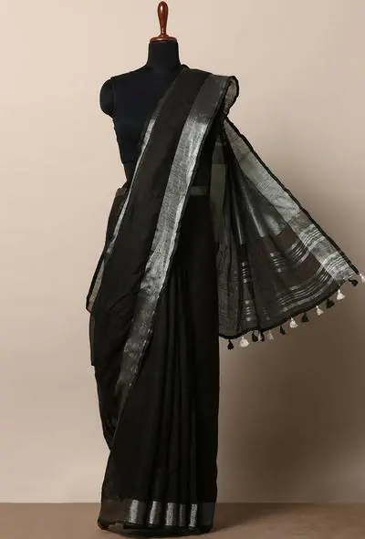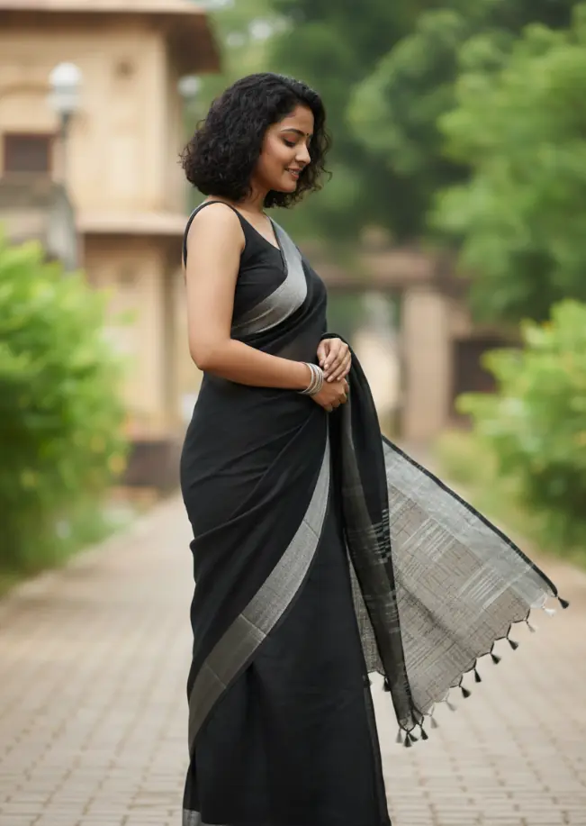A timeless black handwoven cotton saree highlighted with a subtle grey border, crafted for effortless elegance and everyday sophistication.