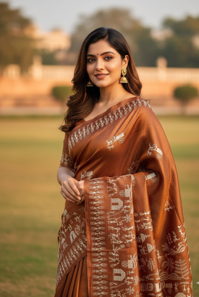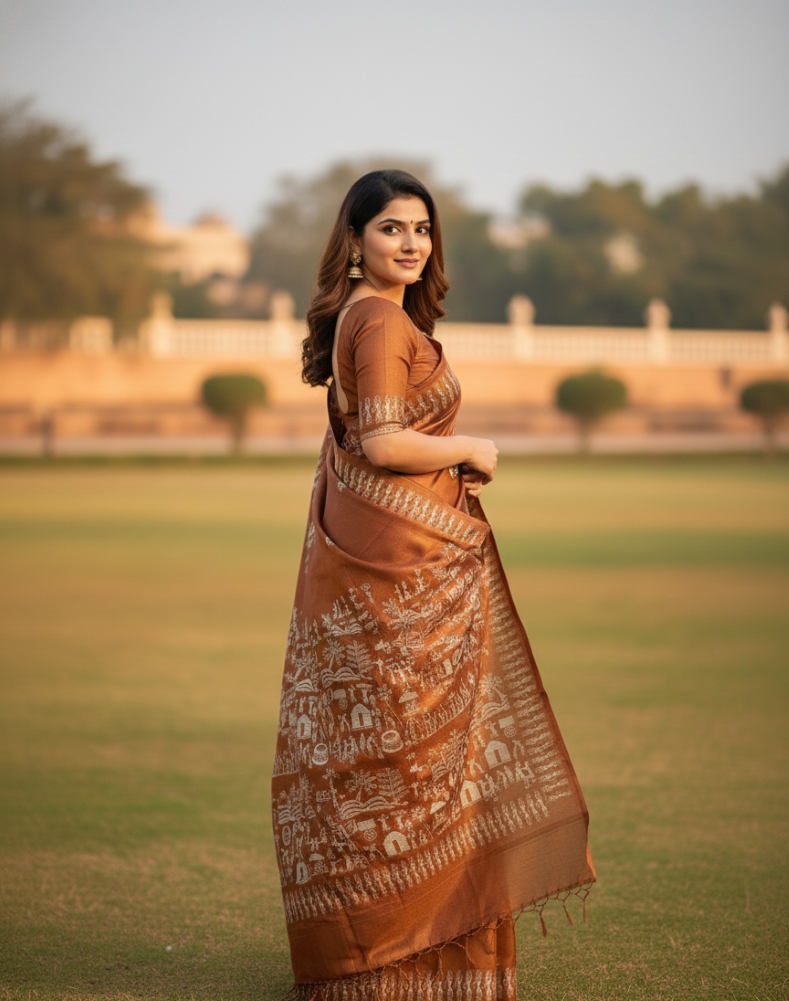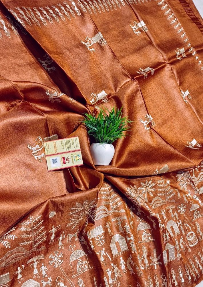 A rich handwoven Kosa silk saree in warm copper tones, adorned with traditional folk narratives for timeless cultural elegance.