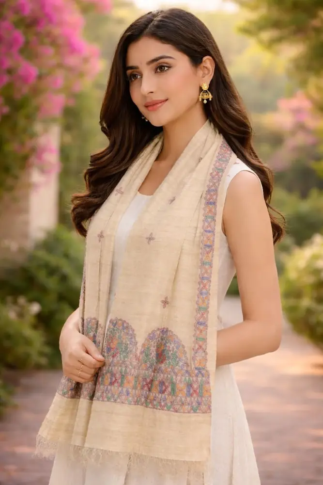 This Gicha silk stole is handcrafted by skilled artisans using traditional handloom techniques. Woven from naturally textured Gicha silk yarns, the soft ivory base is highlighted with a finely detailed multicolour woven border inspired by folk geometry. Light yet graceful, it drapes beautifully and carries the quiet charm of artisanal craftsmanship.