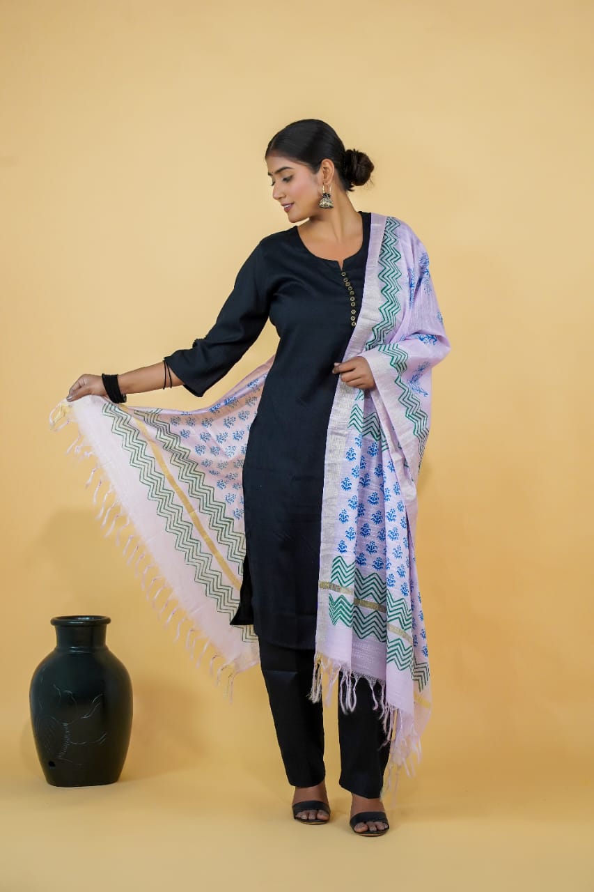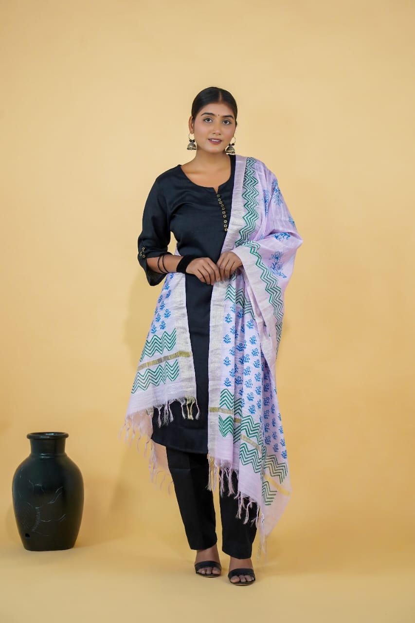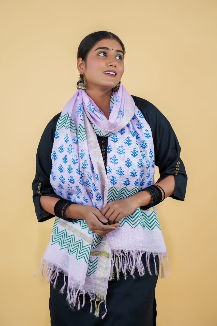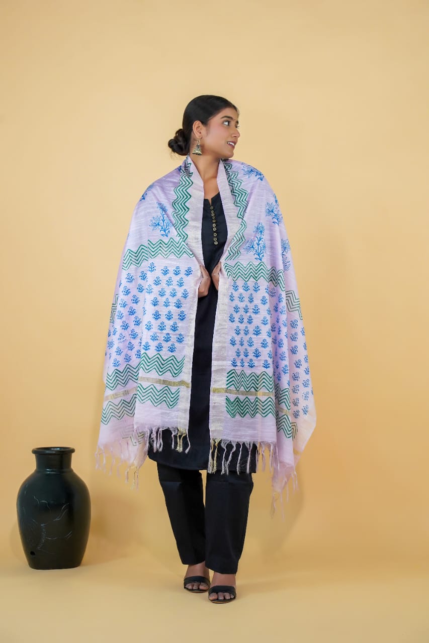 Showcasing a blend of chevron and floral block prints, this lavender cotton dupatta brings together traditional motifs with soft modern colors. Made from 100% pure cotton and handmade with care, it’s an effortlessly elegant piece.