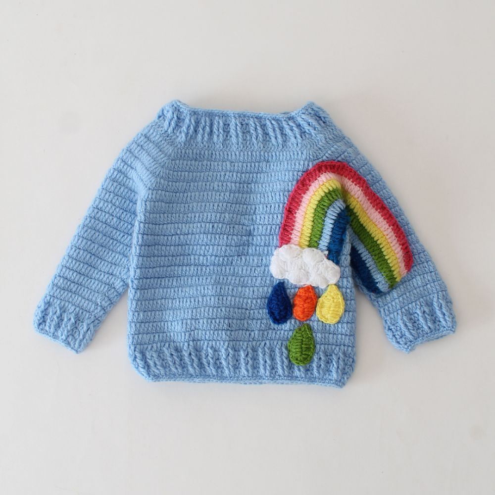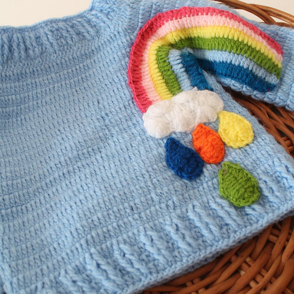 Pattern: The body and sleeves showcase a textured knit pattern, while there’s a delightful rainbow appliqué on one sleeve.