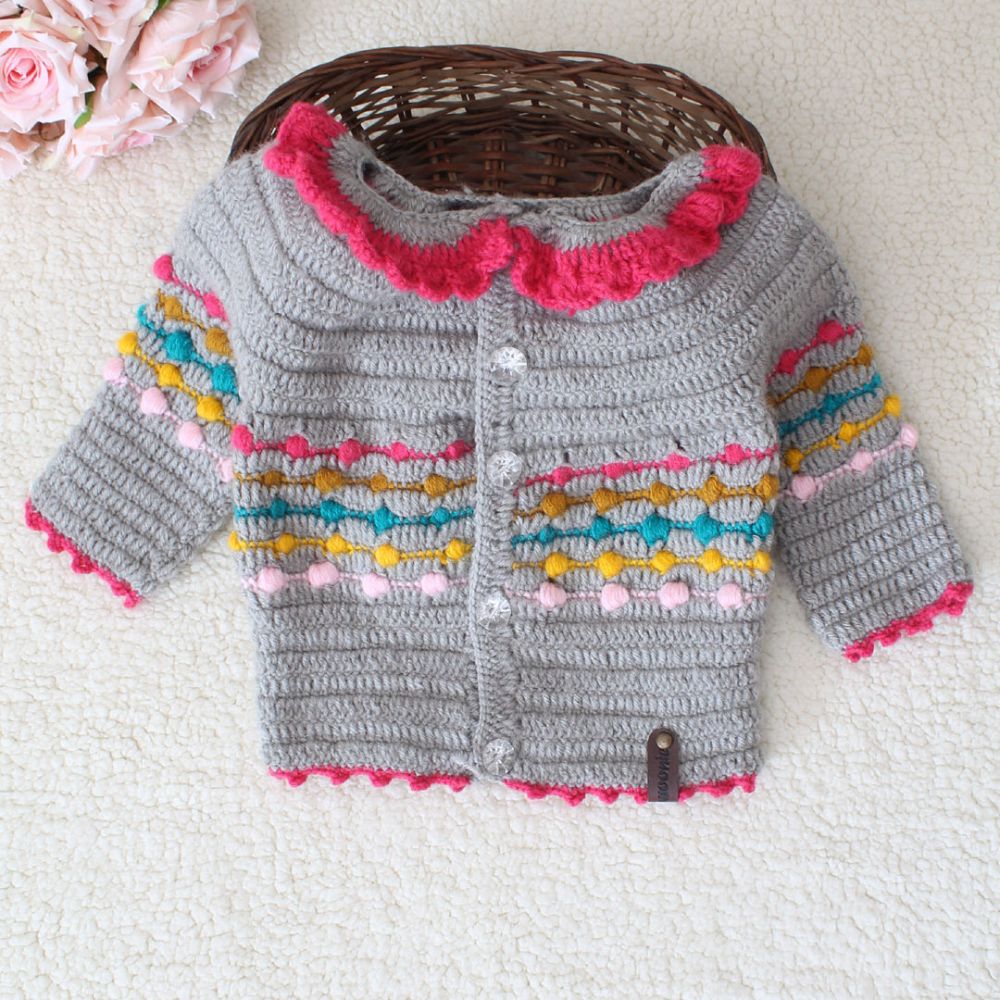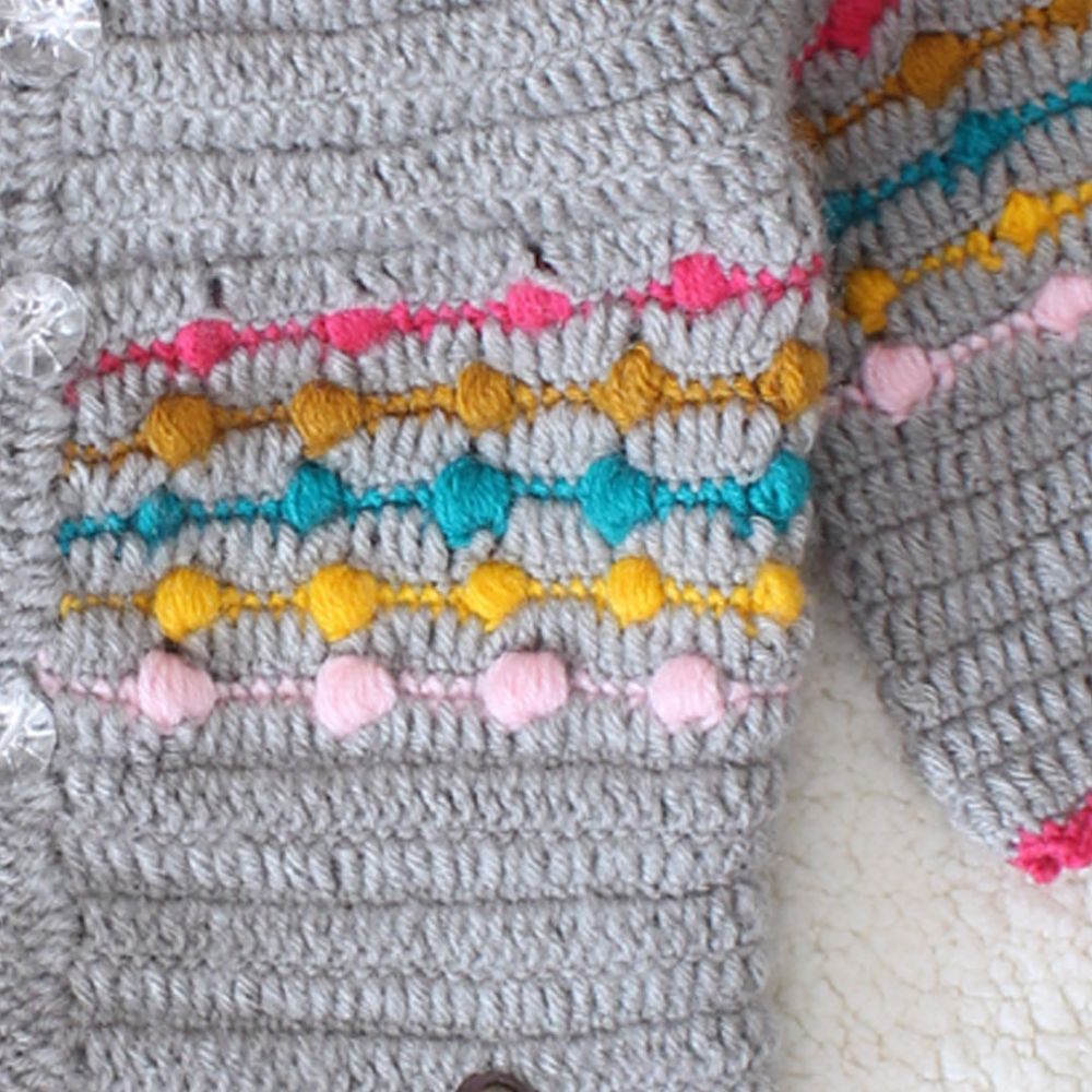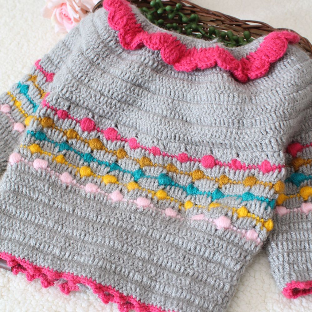 The sweater appears to be made of soft yarn, which suggests warmth and comfort. It features horizontal stripes in pastel colors (pink, yellow, blue, and green) on a grey base. The playful mix of colors gives it a cheerful vibe.Overall, it’s a cozy and stylish children’s sweater perfect for chilly days.