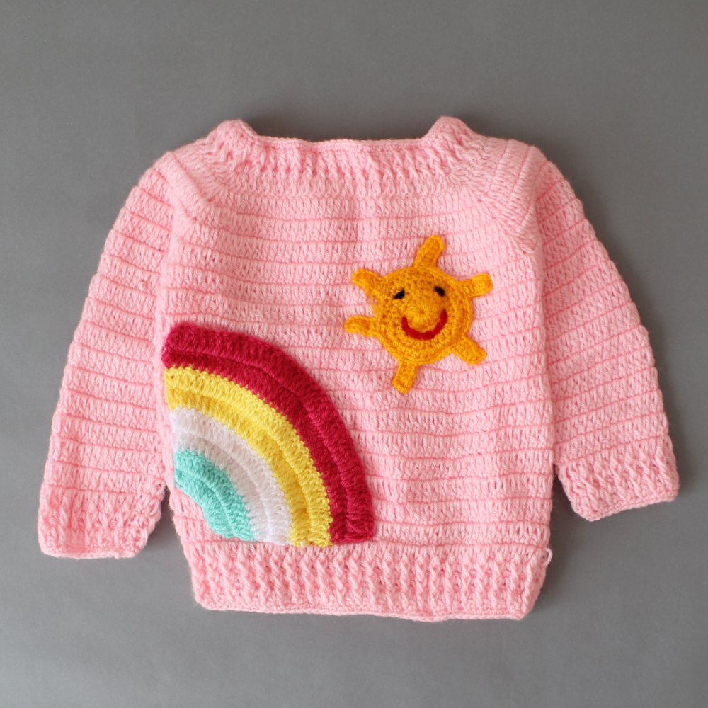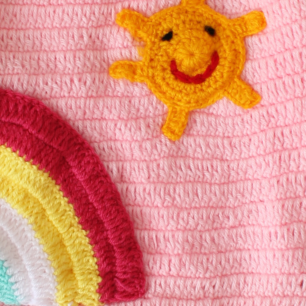 It features a ribbed texture with horizontal lines.On the front, there are two adorable applique designs:A smiling sun in yellow with rays extending outward.A multicolored rainbow with stripes in red, orange, yellow, green, blue, and purple curving down from the sun.